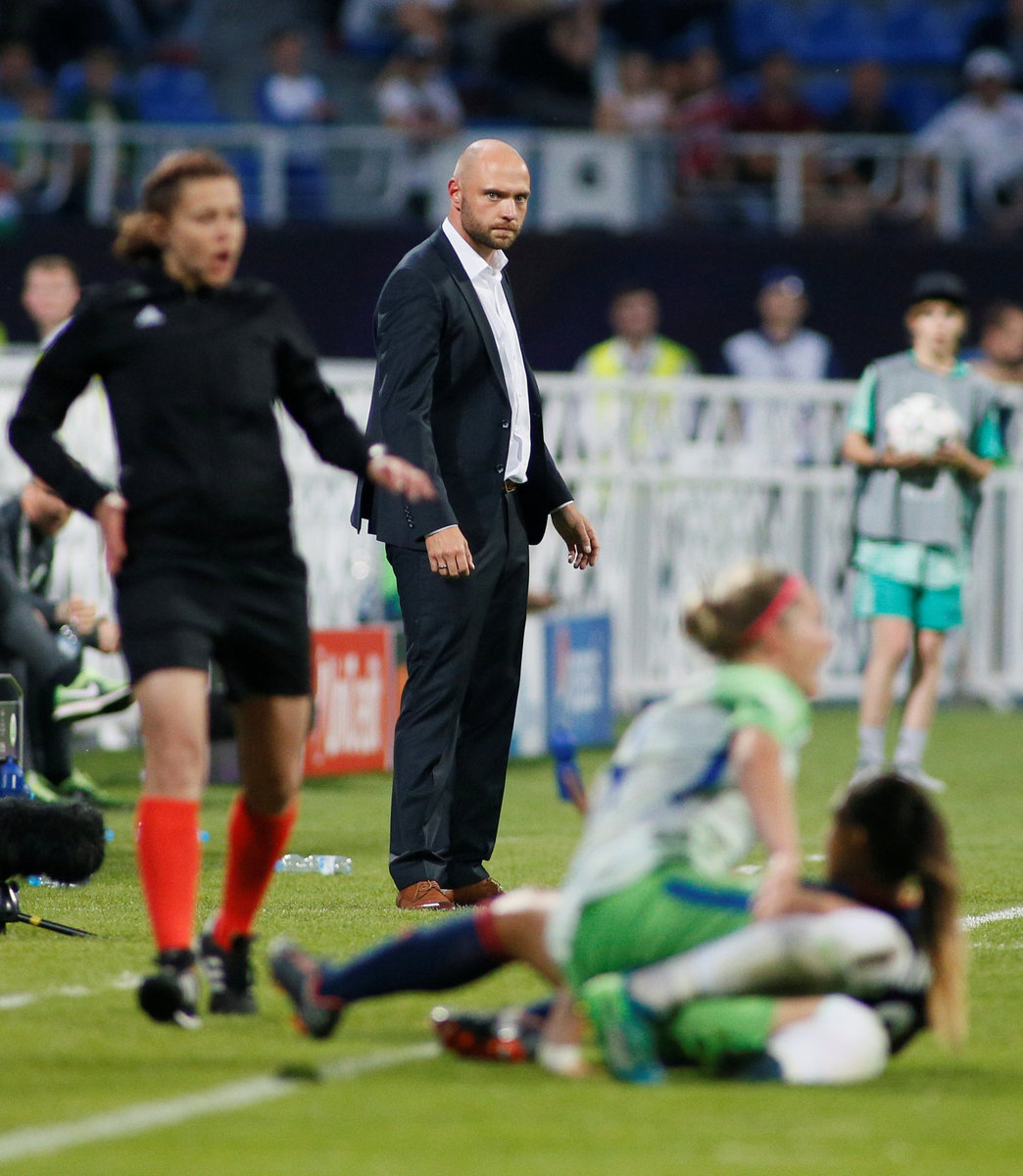 Soccer Football - Women's Champions League Final - Olympique Lyonnais vs VfL Wolfsburg - Valeriy Lobanovskyi Stadium, Kiev, Ukraine - May 24, 2018 Wolfsburg coach Stephan Lerch speaks with his players before extra time REUTERS/Valentyn Ogirenko