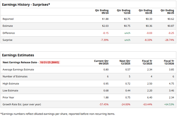 The chemicals industry giant is gearing up to announce its third-quarter results before the markets open on Friday, Oct. 31. Ahead of the event, analysts expect LYB to deliver a non-GAAP profit of $0.80 per share, down a staggering 57.5% from $1.88 per share reported in the year-ago quarter. While the company has met the Street’s bottom-line estimates once over the past four quarters, it has missed the projections on three other occasions.