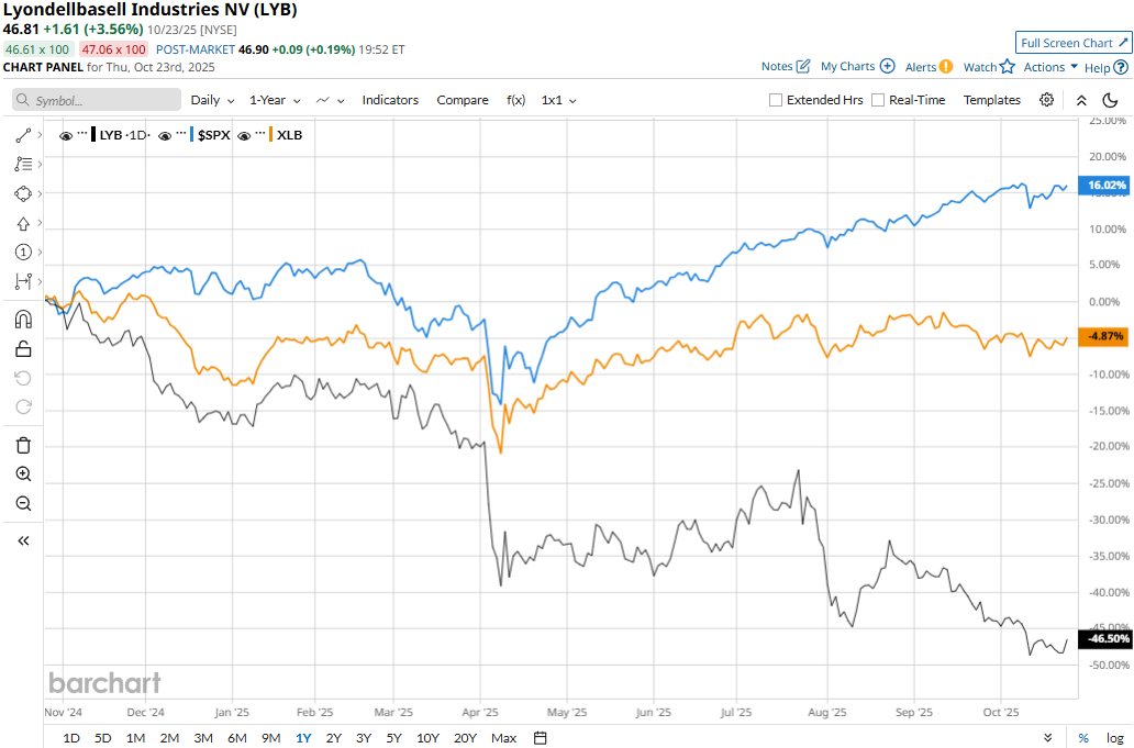 LYB stock prices have tanked 47.3% over the past 52 weeks, notably underperforming the Materials Select Sector SPDR Fund’s (XLB) 6.6% decline and the S&P 500 Index’s ($SPX) 16.2% returns during the same time frame.