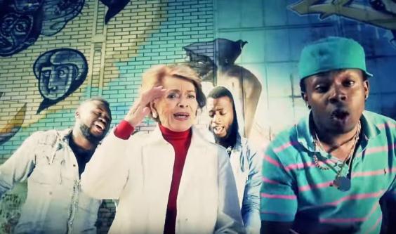 In the video for the new song, her fellow artists, in between doing backflips and mid-air corkscrew twists, help her on to a skateboard.