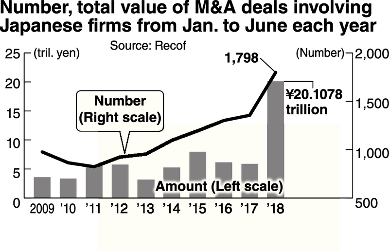 Backed by strong business performances and the nation's ultralow interest rates, many Japanese companies have aimed for growth by acquiring overseas companies. According to a survey by M&A advisory company Recof Corp., the value of such deals involving Japanese companies, including capital participation, totaled more than 20.1078 trillion yen on a reported basis from January to June. This is the highest amount since the survey began in 1985, a period that includes the bubble economy.