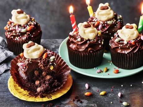 The cupcakes are topped with chocolate buttercream, sprinkles and a mini version of Colin the Caterpillar's signature white chocolate face.