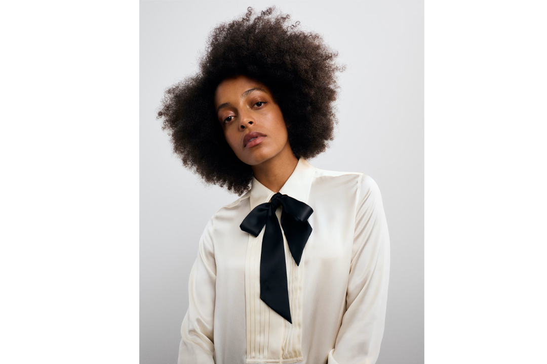 Complementing the retro feel of the black suit, there’s this silky white shirt. The vintage-inspired piece features pleating down the front, a statement pointed collar and a black neck tie that gives it an androgynous feel. The floaty fabric will create a drapey silhouette that’s ideal for tucking into high-waisted trousers or jeans.