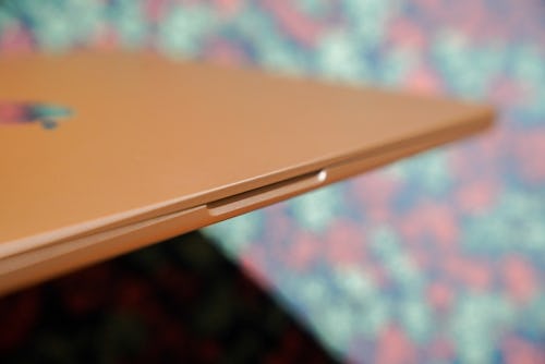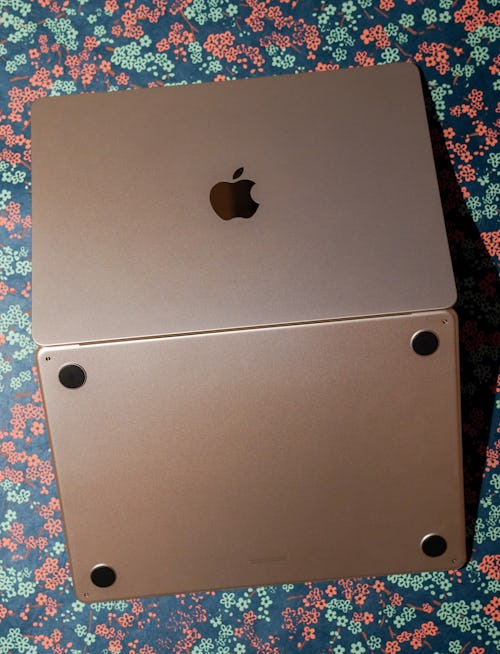 As expected, the tolerances of the M2 MacBook Air are incredible. The unibody construction feels solid and has no flex. Corner to corner, it's a beautifully crafted machine milled from aluminum. There are four circular pads on the bottom of the M2 MacBook Air that elevate the body off surfaces to help with cooling. Apple is selling the M2 MacBook Air in four colors (silver, space gray, starlight, and midnight); I was sent a loaner starlight model (light gold) for review.