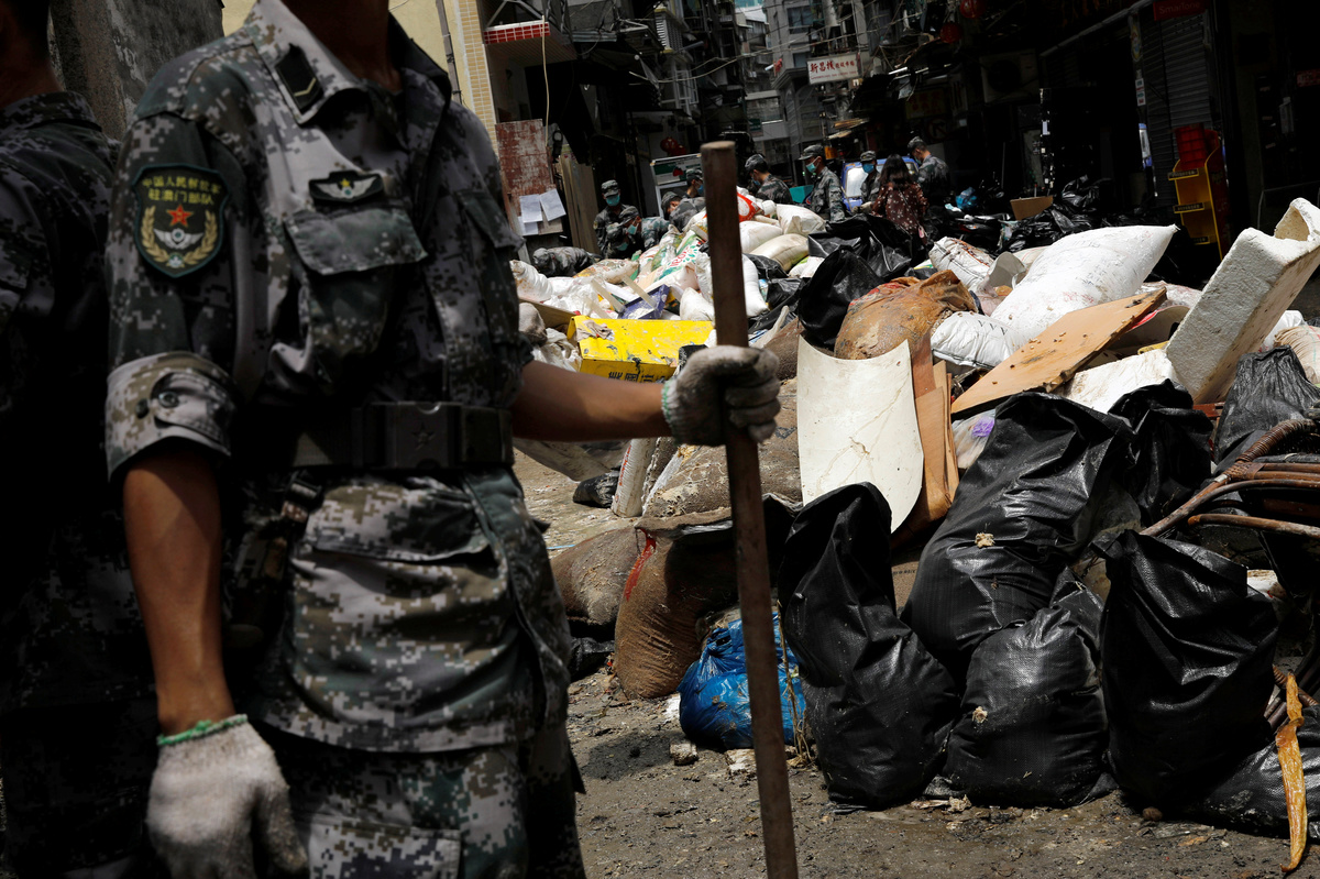 MACAU (Reuters) - Chinese People's Liberation Army troops were deployed on the streets of Macau on Friday to help clean up in the aftermath of a devastating typhoon and amid mounting criticism authorities were unprepared for the severity of the storm.