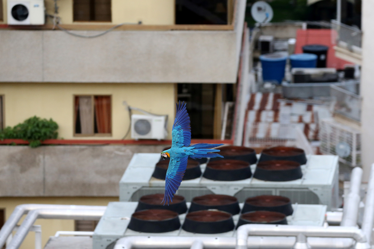 After nearly an hour, two macaws landed on the roof. A third swooped out of the sky and casually perched on her head - releasing two of the typical squawks that often resonate across the city.