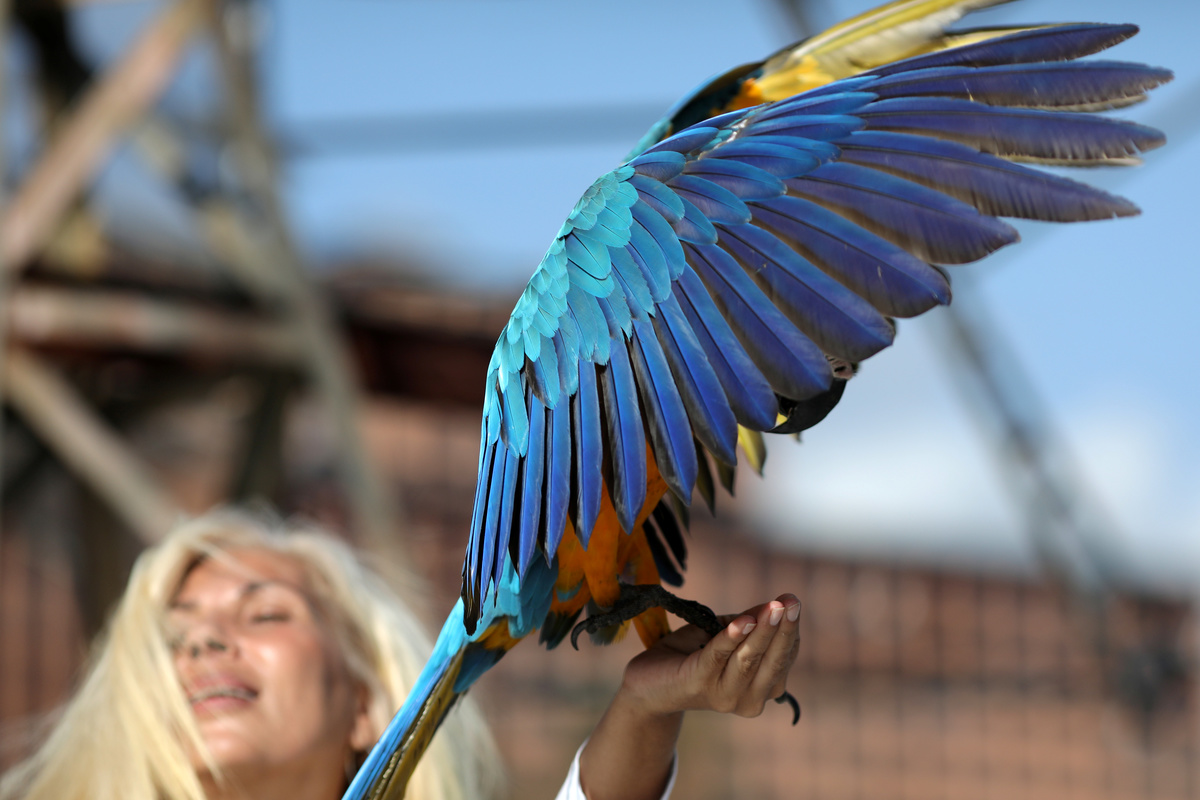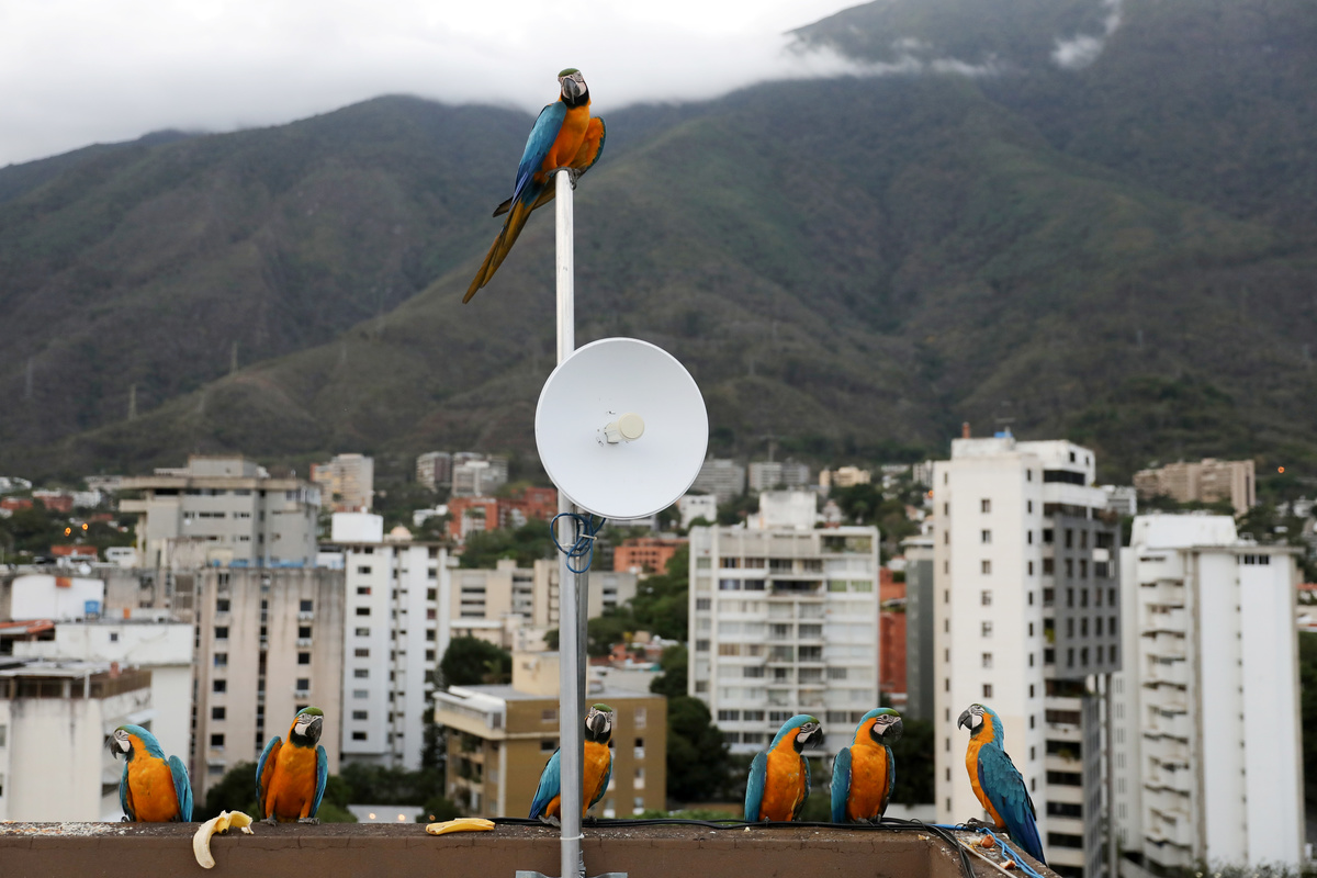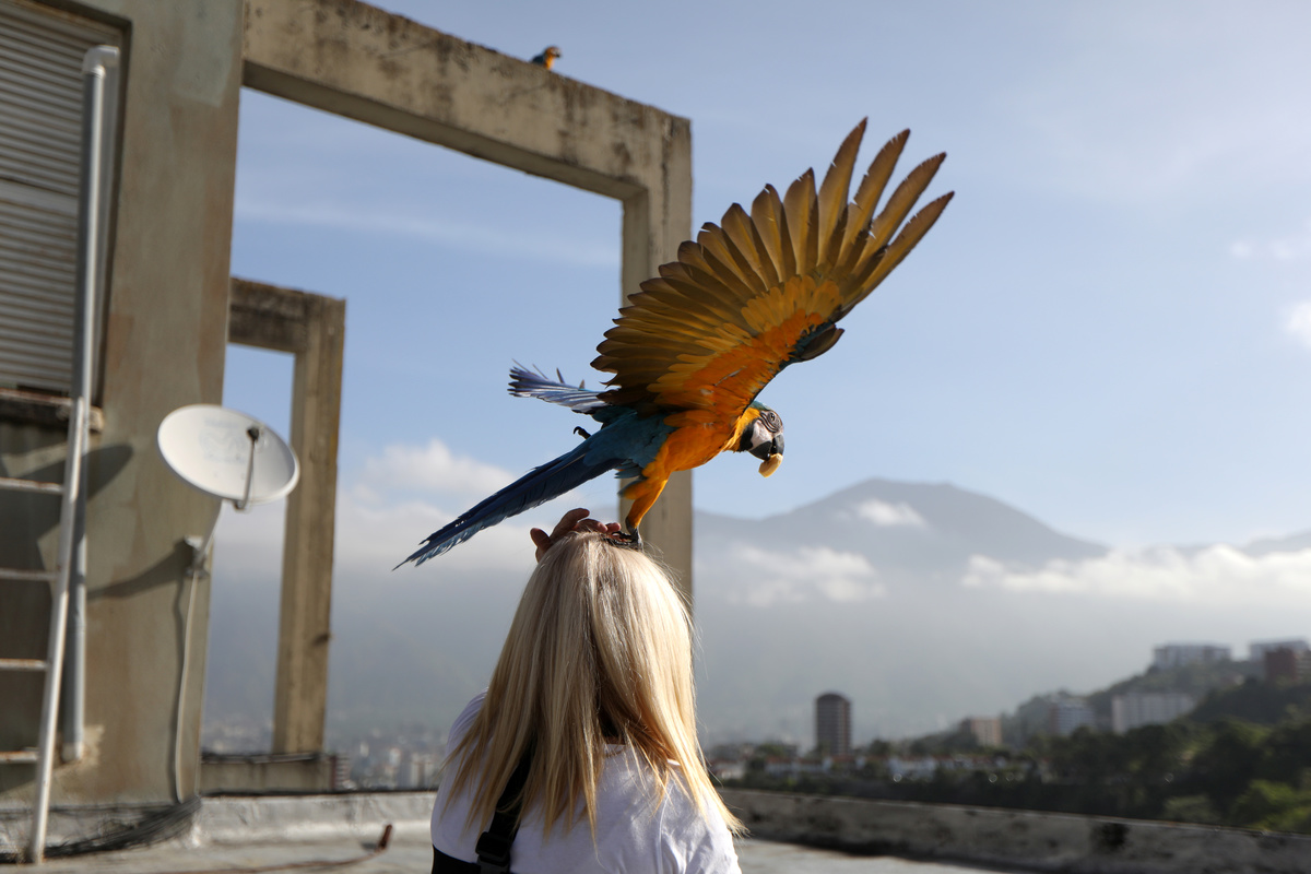 CARACAS (Reuters) - Looking for an escape from the daily realities of crisis-ridden Venezuela, Carmen Borges finds solace receiving visitors on the roof of her Caracas apartment building every morning: groups of blue and gold macaws that arrive at daybreak.