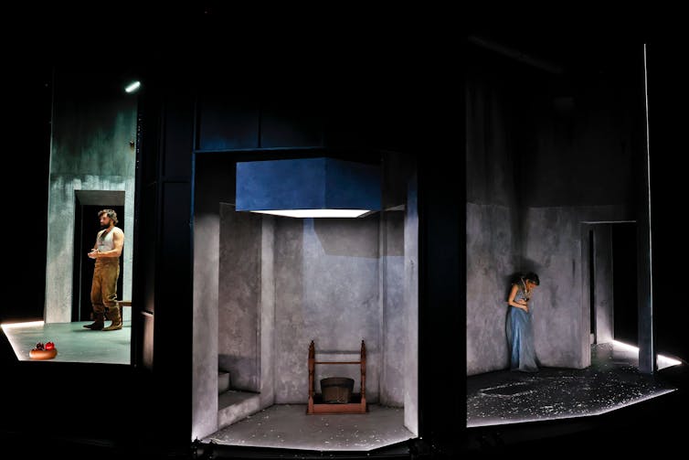 The show’s ten actors largely work in and around Dann Barber’s imposing, monotone set. It is a labyrinthine structure of gunmetal-grey rooms and passageways on a rotating stage. The actors can variously walk around and through Castle Inverness at a pace, or be framed within contained lit vignettes.