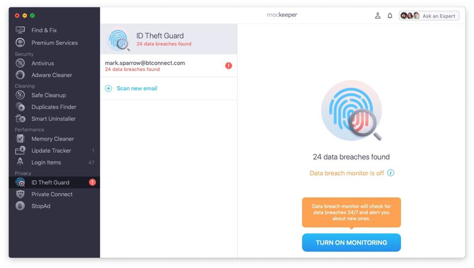 Another important feature is a real-time antivirus that runs 24/7 without slowing down the Mac that MacKeeper is installed on. The antivirus module scans the Mac and keeps it safe from viruses and malware. The Adware cleaner also runs 24/7 and can remove advertising software that might cause unwanted ads to run. I like the way that MacKeeper can also check passwords and compare them to a list of passwords compromised in leaks and then warns the user which ones need changing.
