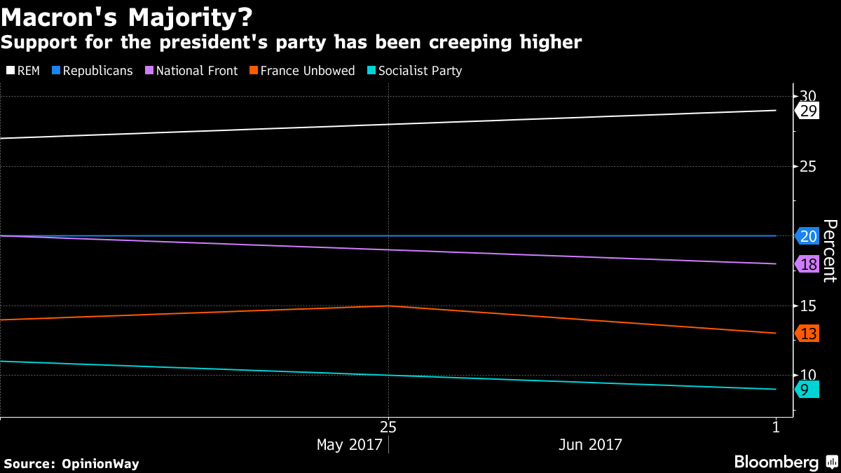 After the second and decisive round of voting June 18, REM and its allies may have more than 375 seats in the 577-member National Assembly, BVA said in its latest poll, well above the 299 needed for a majority. Odoxa said REM will win between 350 and 390 seats, while Ipsos puts the range at 385 to 415.