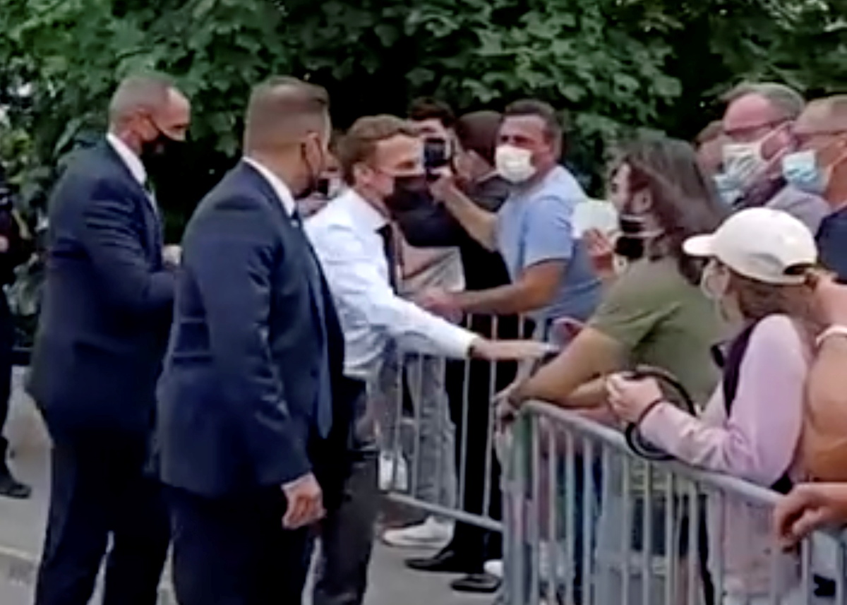 Two of Macron's security detail tackled the man in the T-shirt, and another ushered Macron away. Another video posted on Twitter showed that the president, a few seconds later, returned to the line of onlookers and resumed shaking hands.