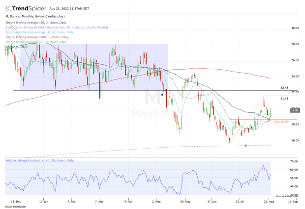 Of course, it’s reasonable to expect that the $22.50 level — which was prior support — will act as resistance, but we’ll find that out later, assuming Macy’s stock can even climb that high.