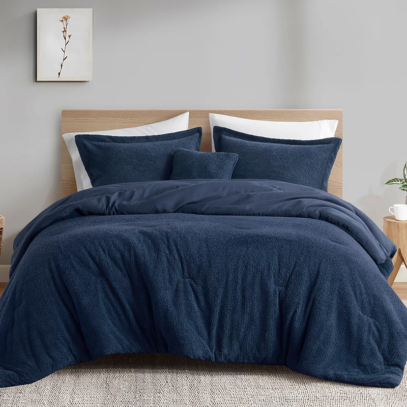 This comforter set is available in four neutral colors, including navy, dark red, gray and ivory, and in sizes full, queen, or king. Each piece is made from a 100% polyester faux feathersoft fabric that can be reversed to a microfiber fabric for additional comfort and softness. These two materials will give you warmth and coziness, no matter the season.