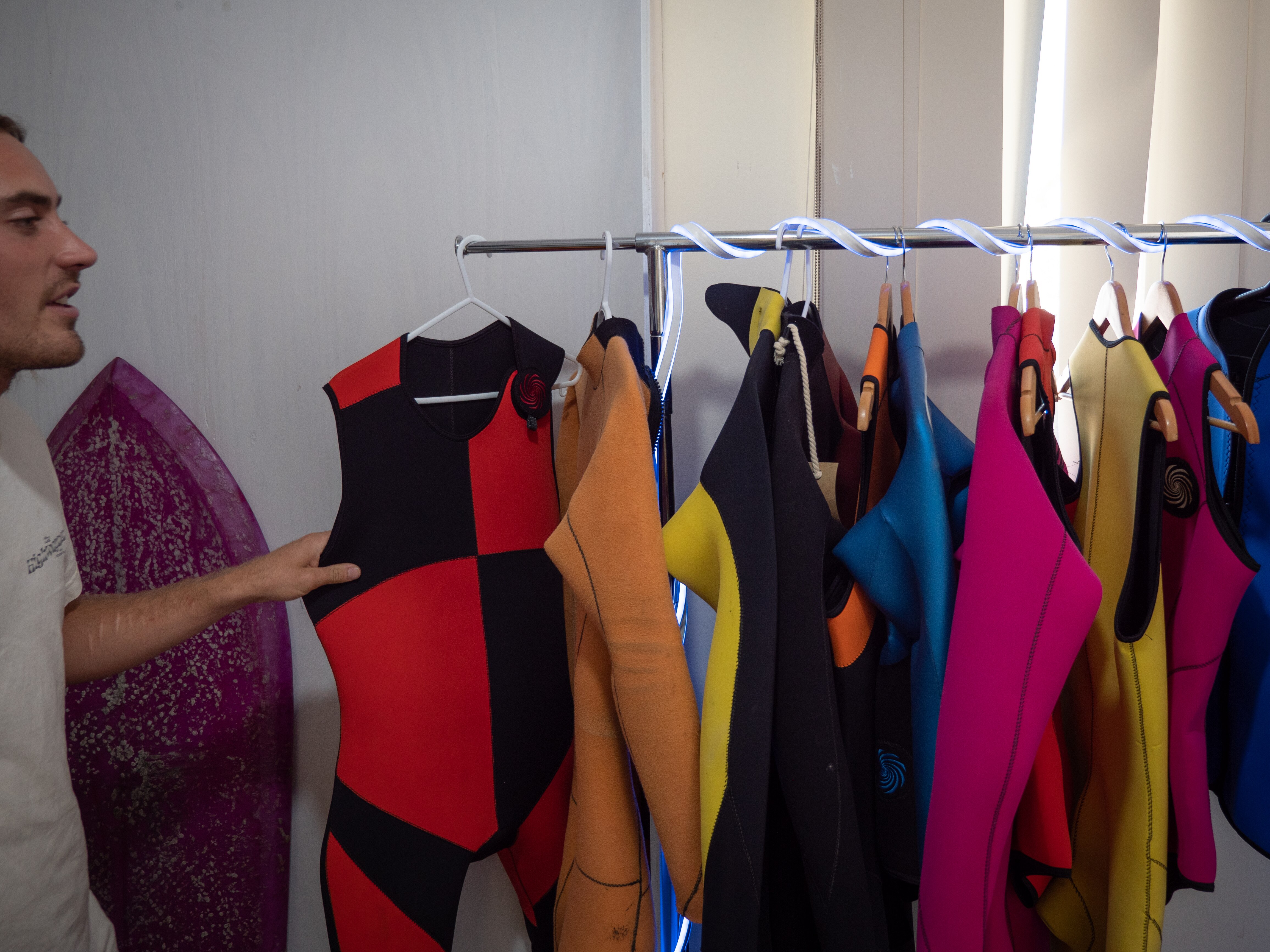 It operates two to three days a week, stitching wetsuits for clients who visit in person to be measured, placing custom orders for suits in the style and colour of their choosing.