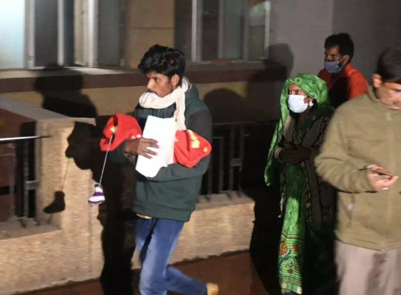 Parents take their babies out from Kamala Nehru Hospital after a fire in the paediatric care unit