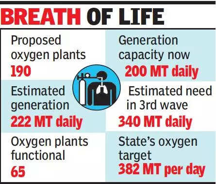 BHOPAL: Oxygen availability in Madhya Pradesh has gone up from 80 metric tonnes (MT) to 200 MT since April 1, after lessons learnt in the devastating second wave, but it still falls short of the 340MT estimated to be needed in the event of a third wave. The state government is already in touch with the Centre for extra oxygen.