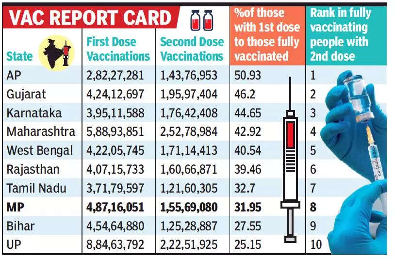 BHOPAL: After administering 4.87 crore first doses of Covid-19 vaccine jabs against an estimated 5.5 crore people eligible for vaccination, Madhya Pradesh may be on the top among 10 most populated states on first jab front, but when it comes to fully vaccinating these 4.87 crore people, it ranks among the bottom three.
