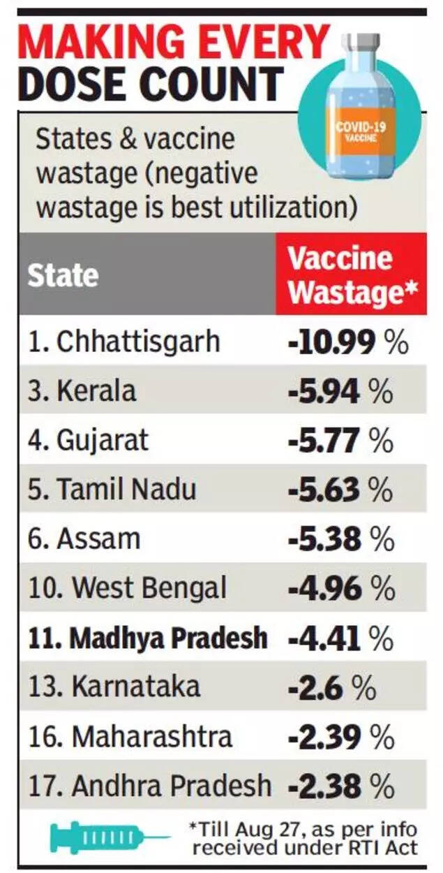 Chhattisgarh tops with 10% 'negative wastage', or 110 doses administered per 100 received, according to information provided under RTI Act by the health ministry to Neemuch-based activist Chandrashekhar Gaur.