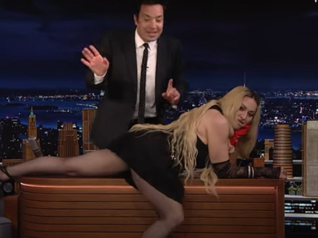 Madonna eventually got down off the desk and told a despairing Fallon: “No one’s going to see anything, my God,” but not before lifting up her dress to flash her underwear to the audience.