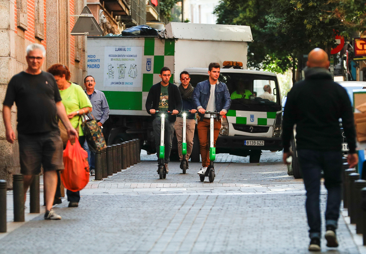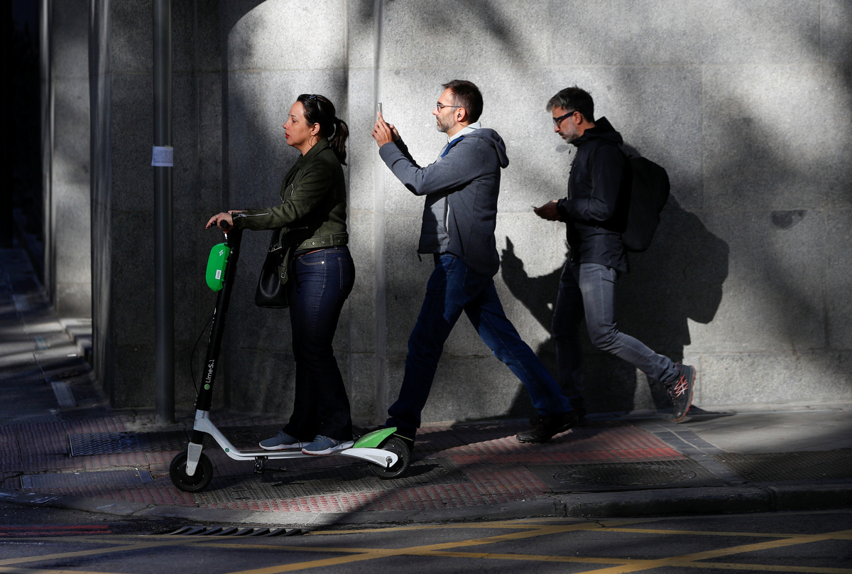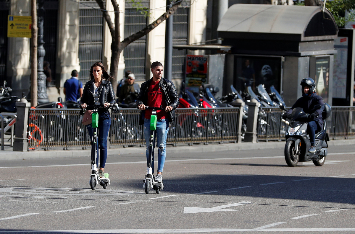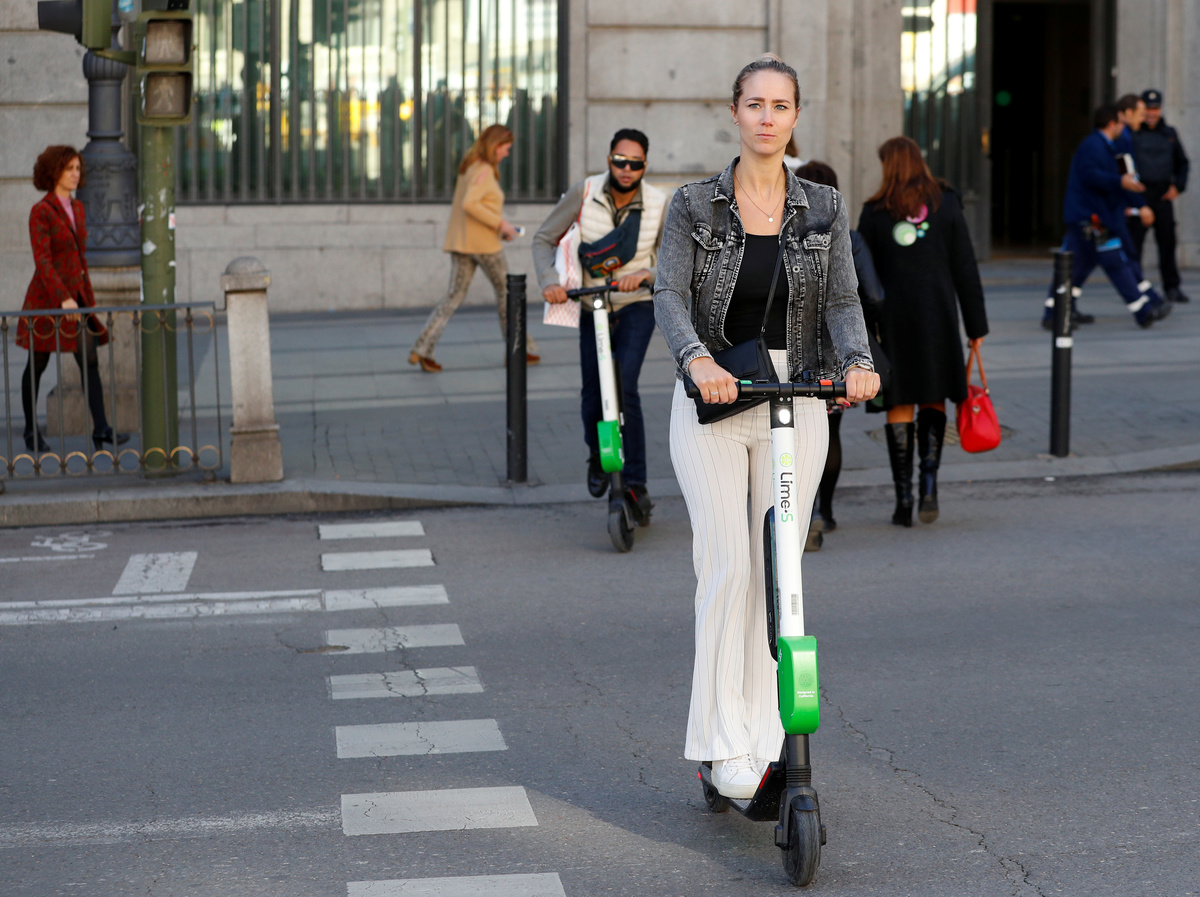 Commuters ride bicycles and an electric scooter on a street in Madrid, Spain, October 24, 2018. REUTERS/Paul HannaPeople ride dock-free electric scooters Lime-S by California-based bicycle and scooter sharing service Lime, on a street in Madrid, Spain, October 24, 2018. REUTERS/Paul HannaA woman rides a dock-free electric scooter Lime-S by California-based bicycle and scooter sharing service Lime, on a sidewalk in Madrid, Spain, October 24, 2018. REUTERS/Paul HannaPeople ride dock-free electric scooters Lime-S by California-based bicycle and scooter sharing service Lime, through a crosswalk in Madrid, Spain, October 24, 2018. REUTERS/Paul HannaPeople ride dock-free electric scooters Lime-S by California-based bicycle and scooter sharing service Lime, over a crosswalk in Madrid, Spain, October 24, 2018. REUTERS/Paul HannaPeople ride dock-free electric scooters Lime-S by California-based bicycle and scooter sharing service Lime, on a street in Madrid, Spain, October 24, 2018. REUTERS/Paul Hanna