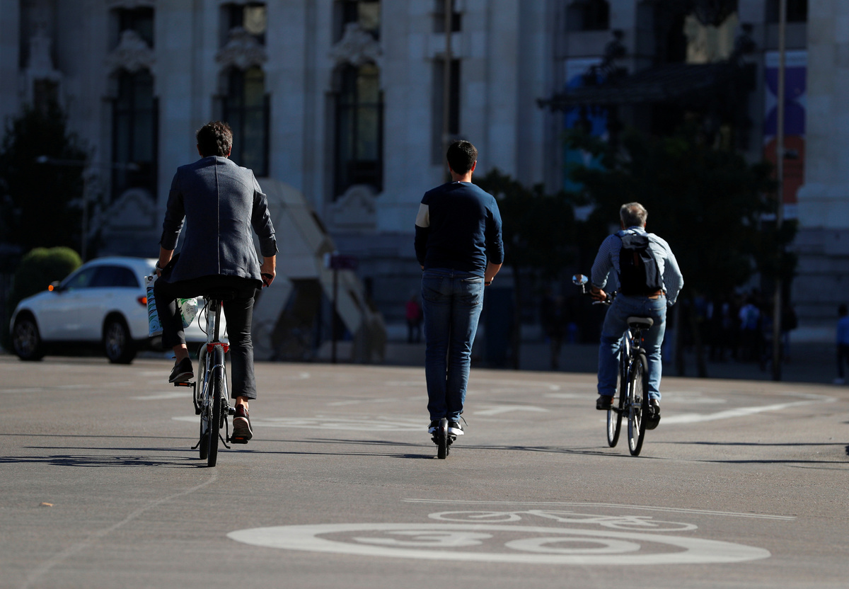 People ride bicycles and an electric scooter on a street in Madrid, Spain, October 24, 2018. REUTERS/Paul Hanna