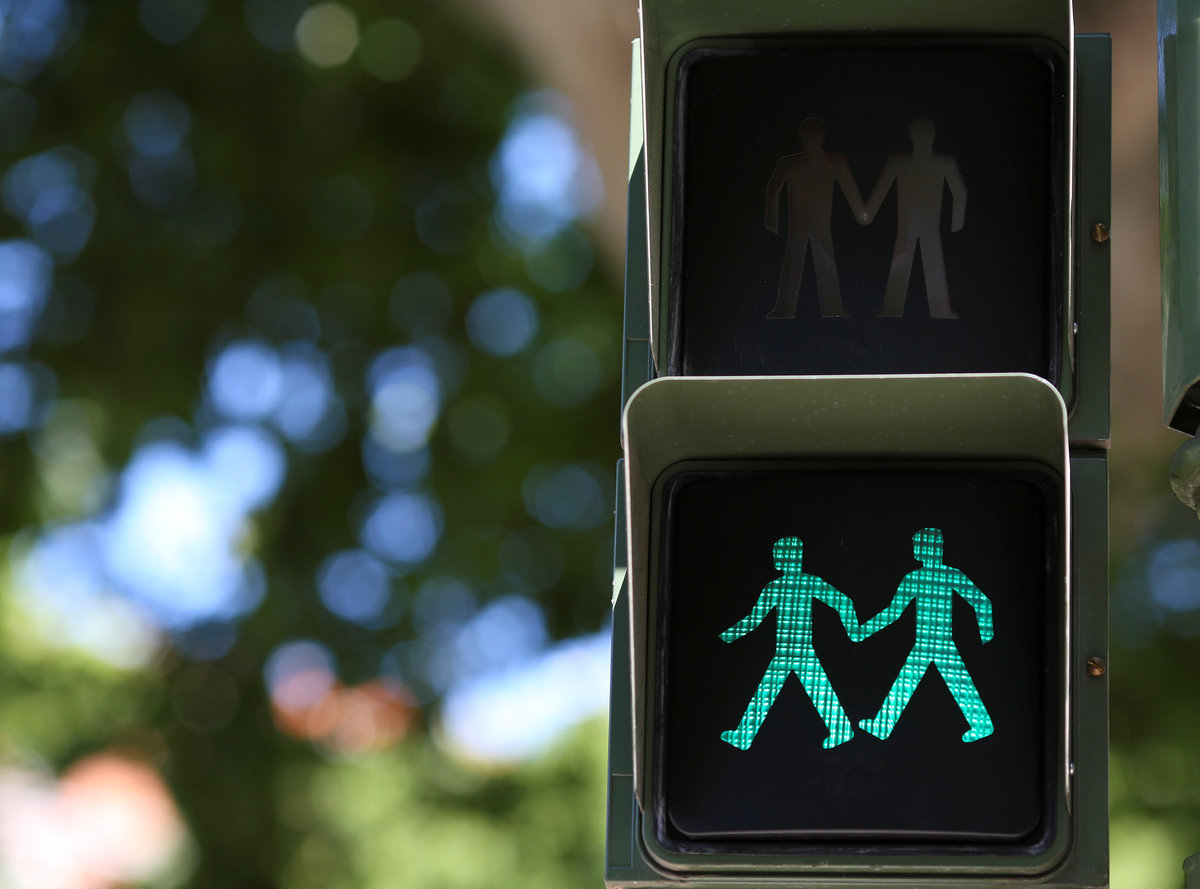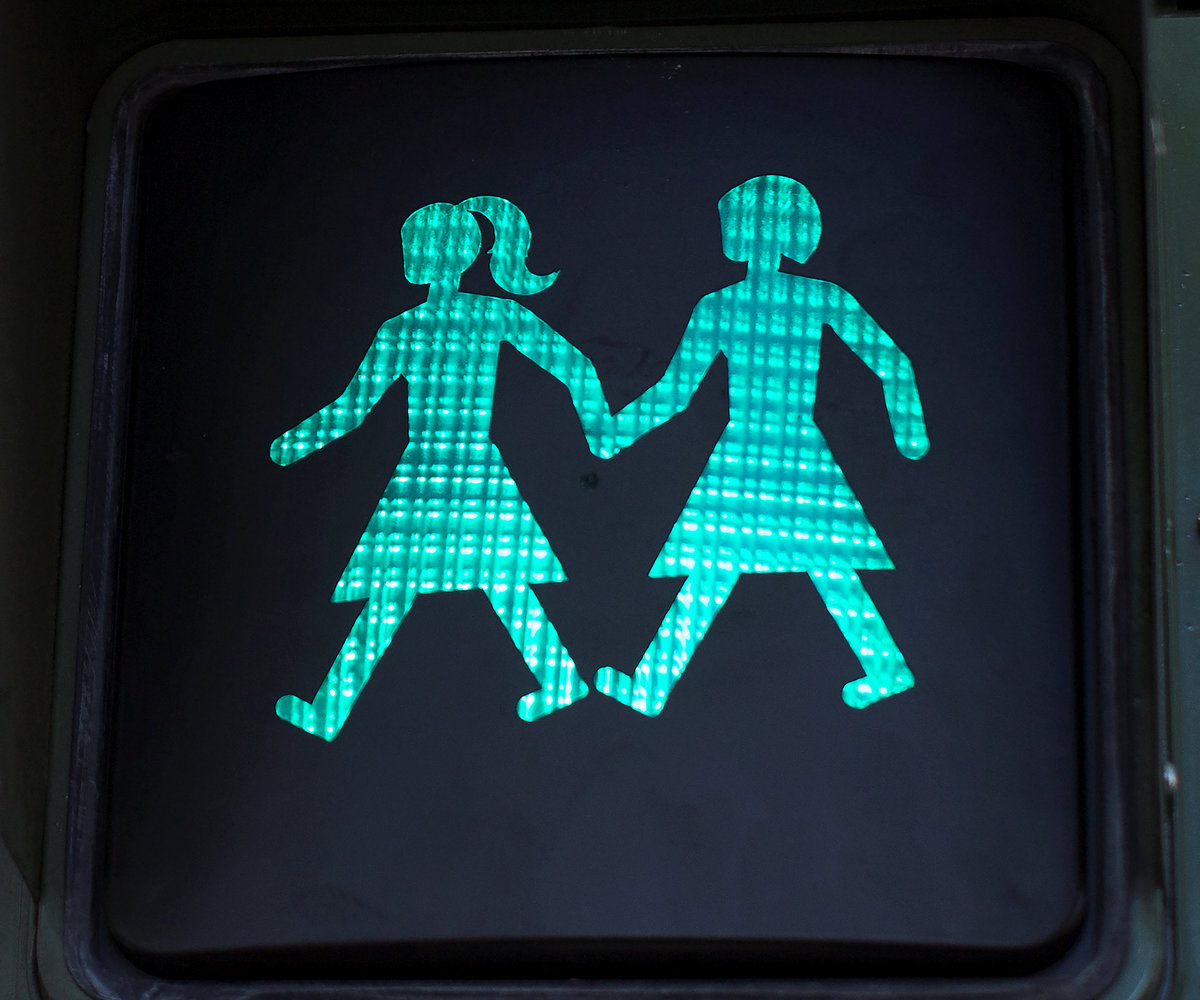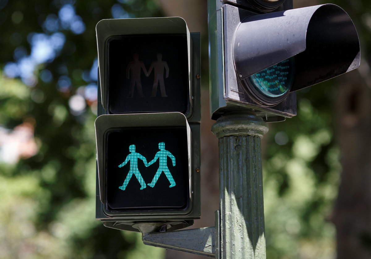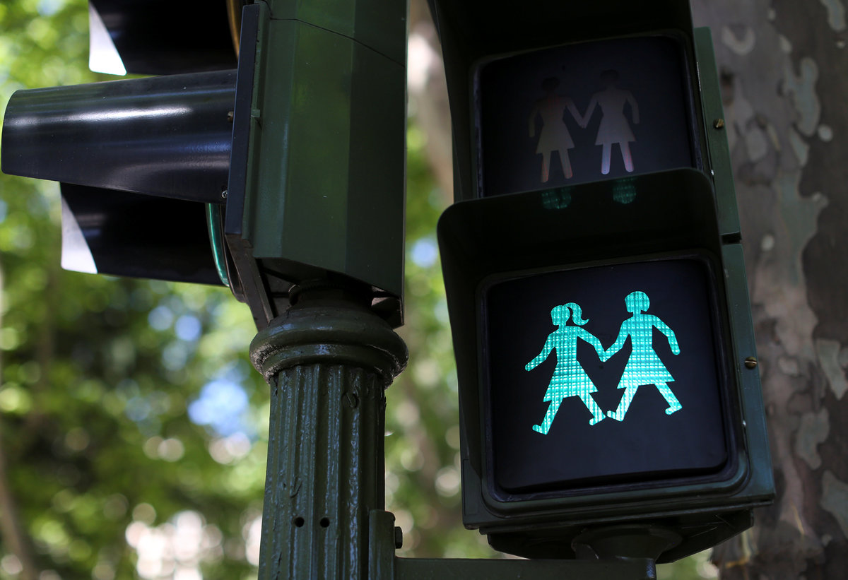 The traffic lights, which have been installed on pedestrian crossings and will remain in place once the festival is over, show same or different-sex couples holding hands, either crossing the street or standing.