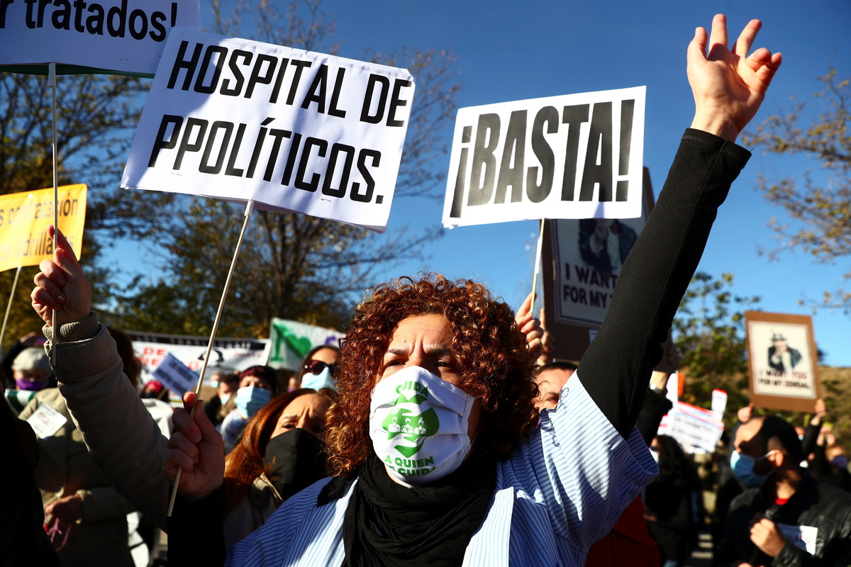 Arriving at the hospital for the inauguration, regional leader Isabel Diaz Ayuso was greeted by dozens of protesting healthcare workers with placards reading: "Without staff there is no hospital" and "Primary care abandoned."