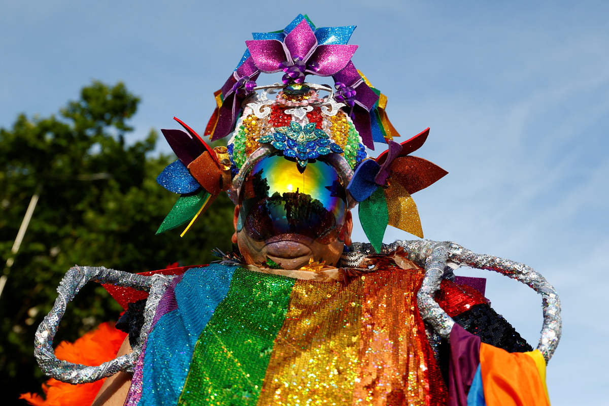 Many wore rainbow face masks at the parade, usually one of the world's largest LGBT pride events, which this year under COVID-19 restrictions did not feature the usual floats and had a limit of 25,000 attendees.