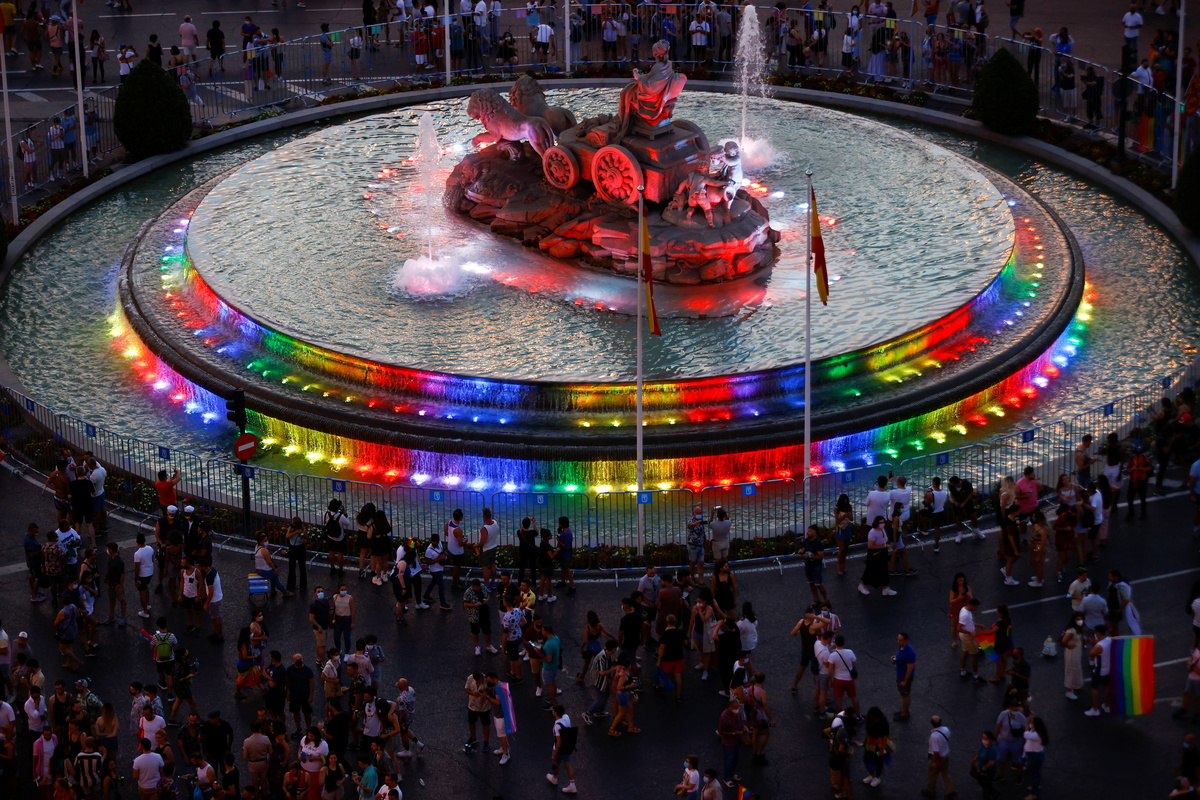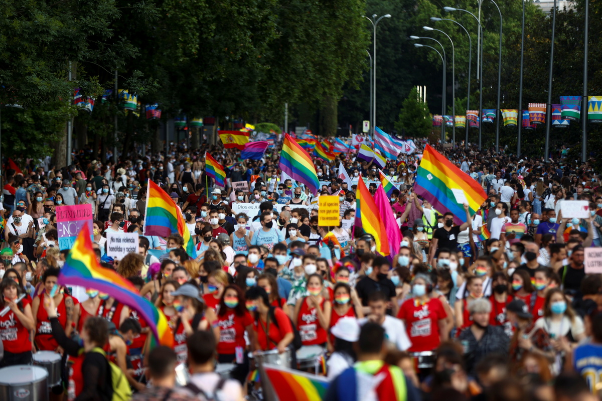 Thousands of people danced, beat drums and waved flags through the streets of Madrid on Saturday as the Spanish capital's gay pride parade returned after being canceled in 2020 because of the COVID-19 pandemic.