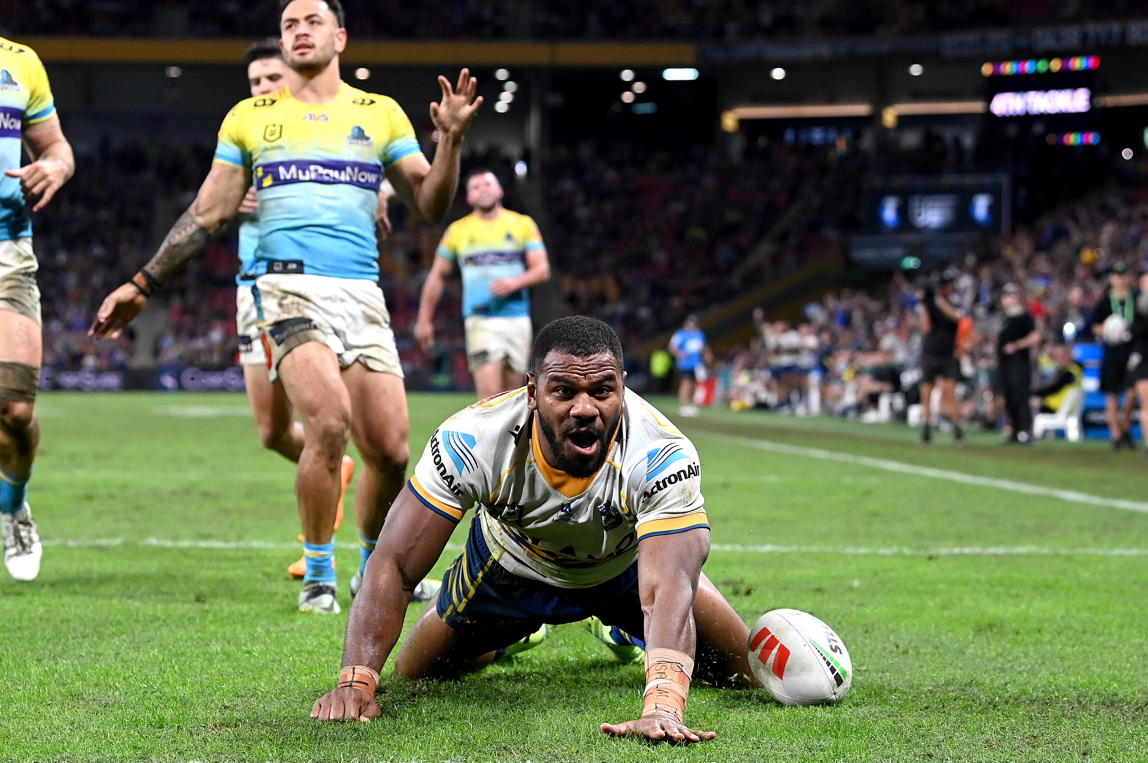 Eels fullback Clint Gutherson found himself sin-binned for holding Alofiana Khan-Pereira back in a try-scoring situation and only 20 seconds later, David Fifita wrestled free of three defenders and offloaded to his five-eighth.