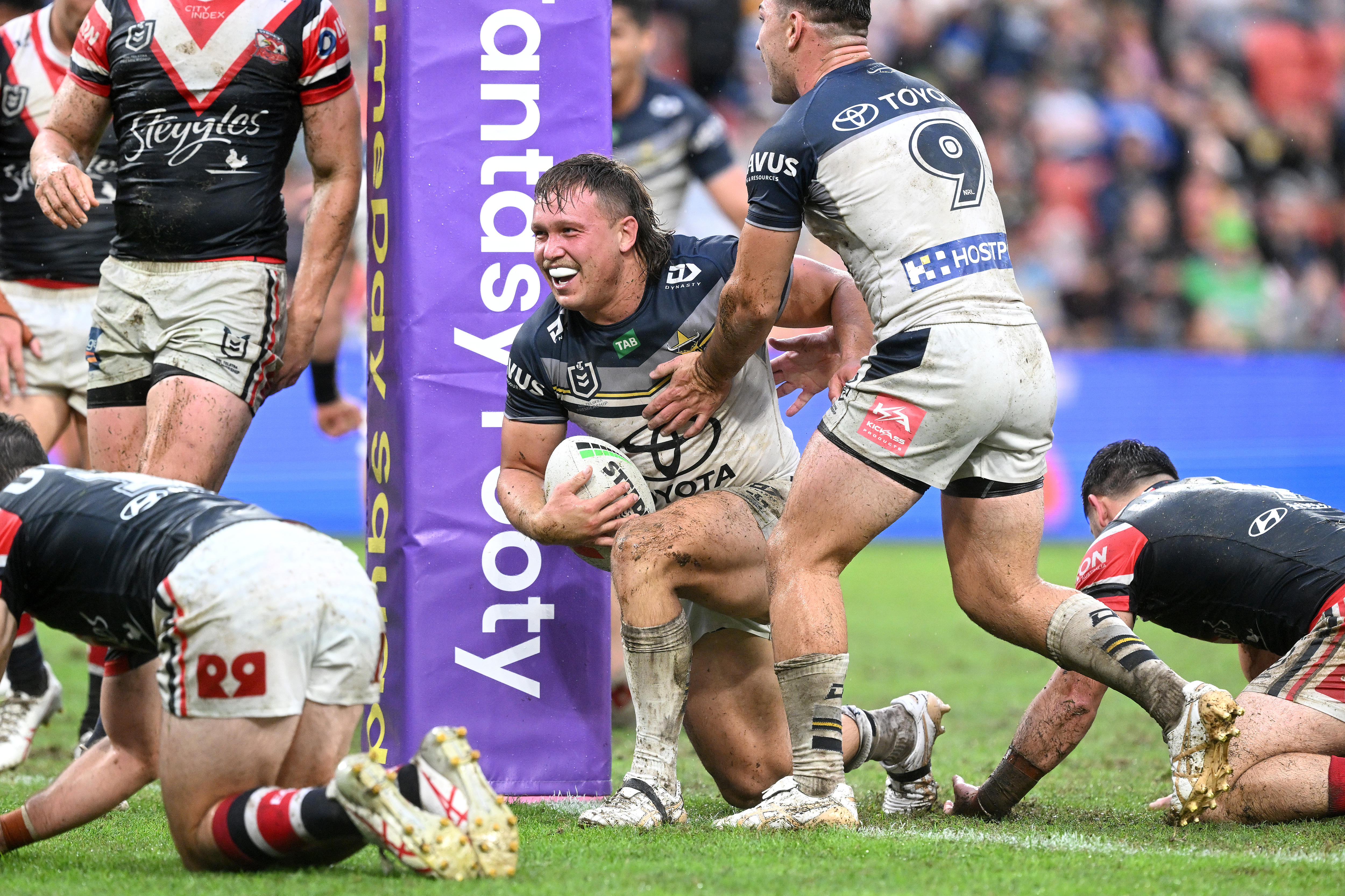 The Cowboys repelled the Roosters at the start of the second half and then struck. Second-rower Jack Gosiewski got his hand on a grubber by Chad Townsend to give them a 12-0 lead before Taulagi showcased the skill and strength that earned him a Queensland jersey in 2022.