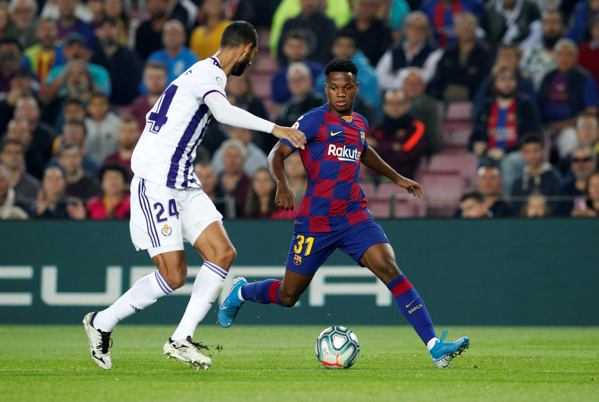 Soccer Football - La Liga Santander - FC Barcelona v Real Valladolid - Camp Nou, Barcelona, Spain - October 29, 2019 Barcelona's Anssumane Fati in action REUTERS/Albert GeaSoccer Football - La Liga Santander - FC Barcelona v Real Valladolid - Camp Nou, Barcelona, Spain - October 29, 2019 Barcelona's Luis Suarez celebrates scoring their fifth goal REUTERS/Albert GeaSoccer Football - La Liga Santander - FC Barcelona v Real Valladolid - Camp Nou, Barcelona, Spain - October 29, 2019 Barcelona's Arturo Vidal celebrates scoring their second goal REUTERS/Albert GeaSoccer Football - La Liga Santander - FC Barcelona v Real Valladolid - Camp Nou, Barcelona, Spain - October 29, 2019 Barcelona's Lionel Messi celebrates scoring their fourth goal REUTERS/Albert GeaSoccer Football - La Liga Santander - FC Barcelona v Real Valladolid - Camp Nou, Barcelona, Spain - October 29, 2019 Barcelona's Luis Suarez in action with Real Valladolid's Mohammed Salisu REUTERS/Albert GeaSoccer Football - La Liga Santander - FC Barcelona v Real Valladolid - Camp Nou, Barcelona, Spain - October 29, 2019 Barcelona coach Ernesto Valverde gestures REUTERS/Albert Gea