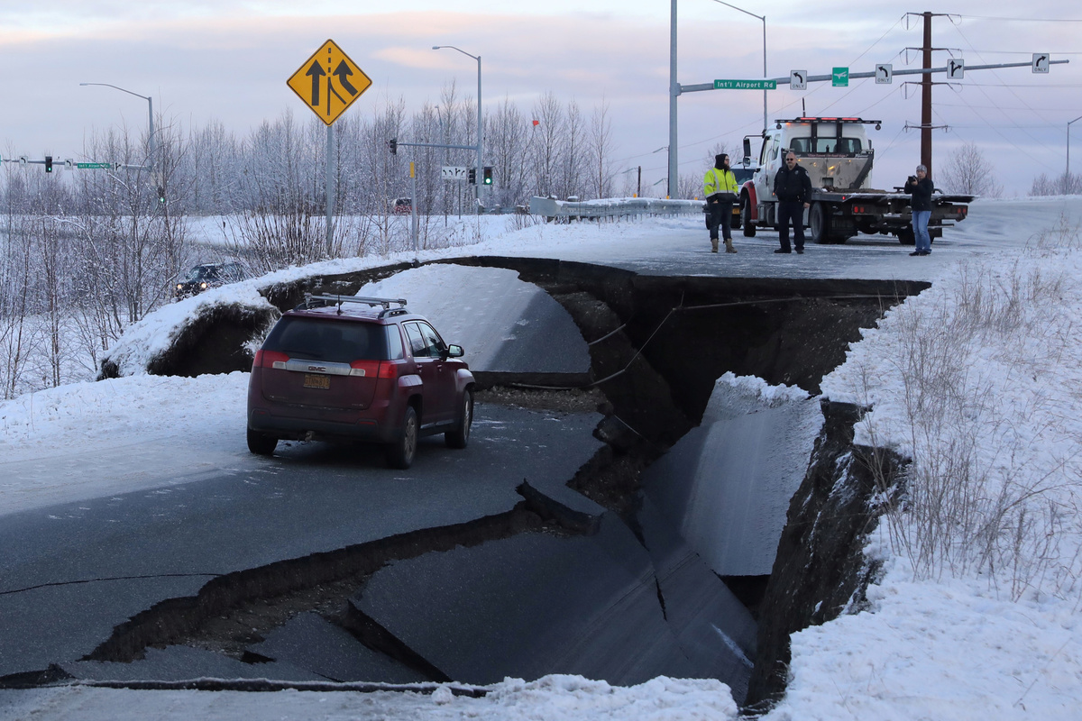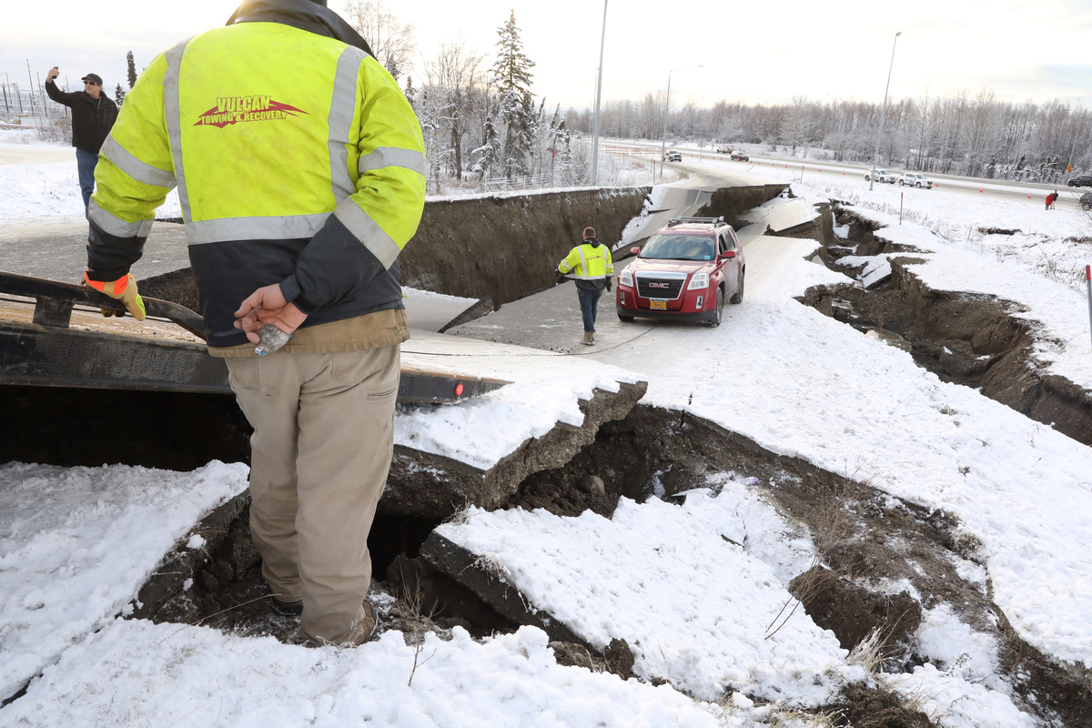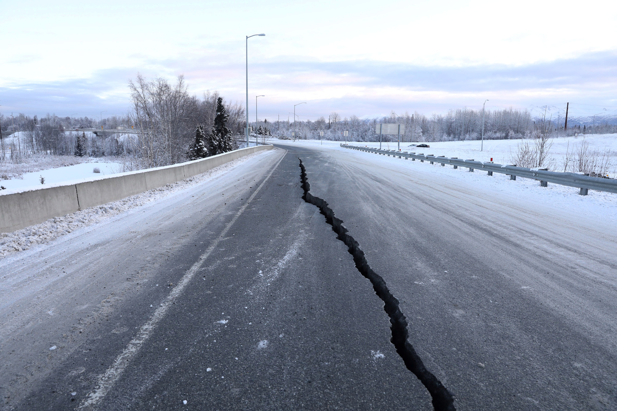 The website for KTUU-TV featured a photo of a snow-covered highway that had buckled, with a car sitting between two deep fissures crossing the highway.