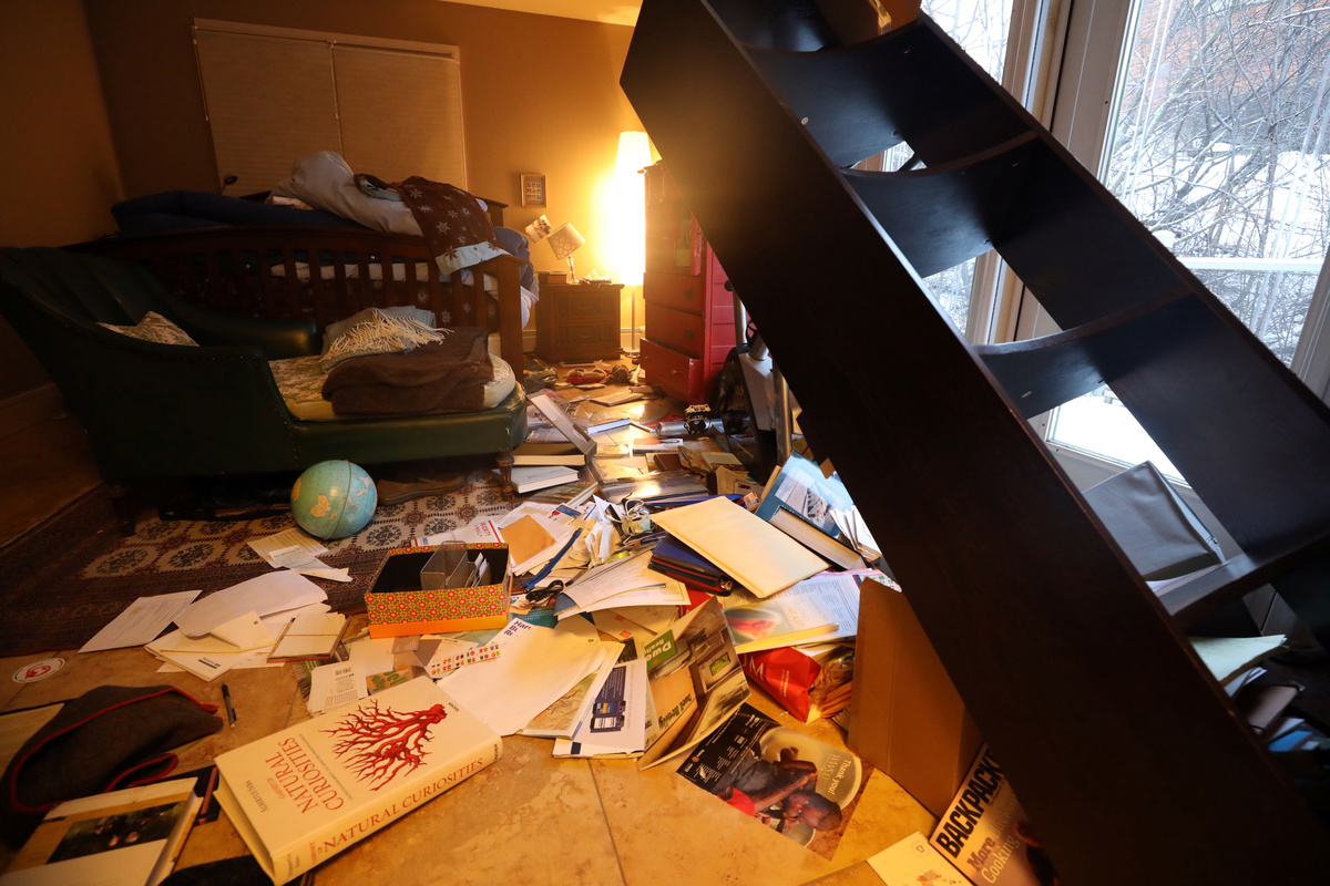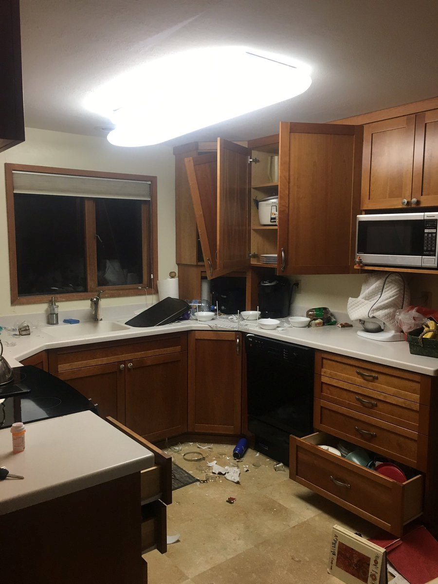 "Thought the house was going to come apart," Anchorage-based climatologist Brian Brettschneider wrote on Twitter, posting a photo showing his kitchen floor scattered with items that had tumbled out of cupboards.