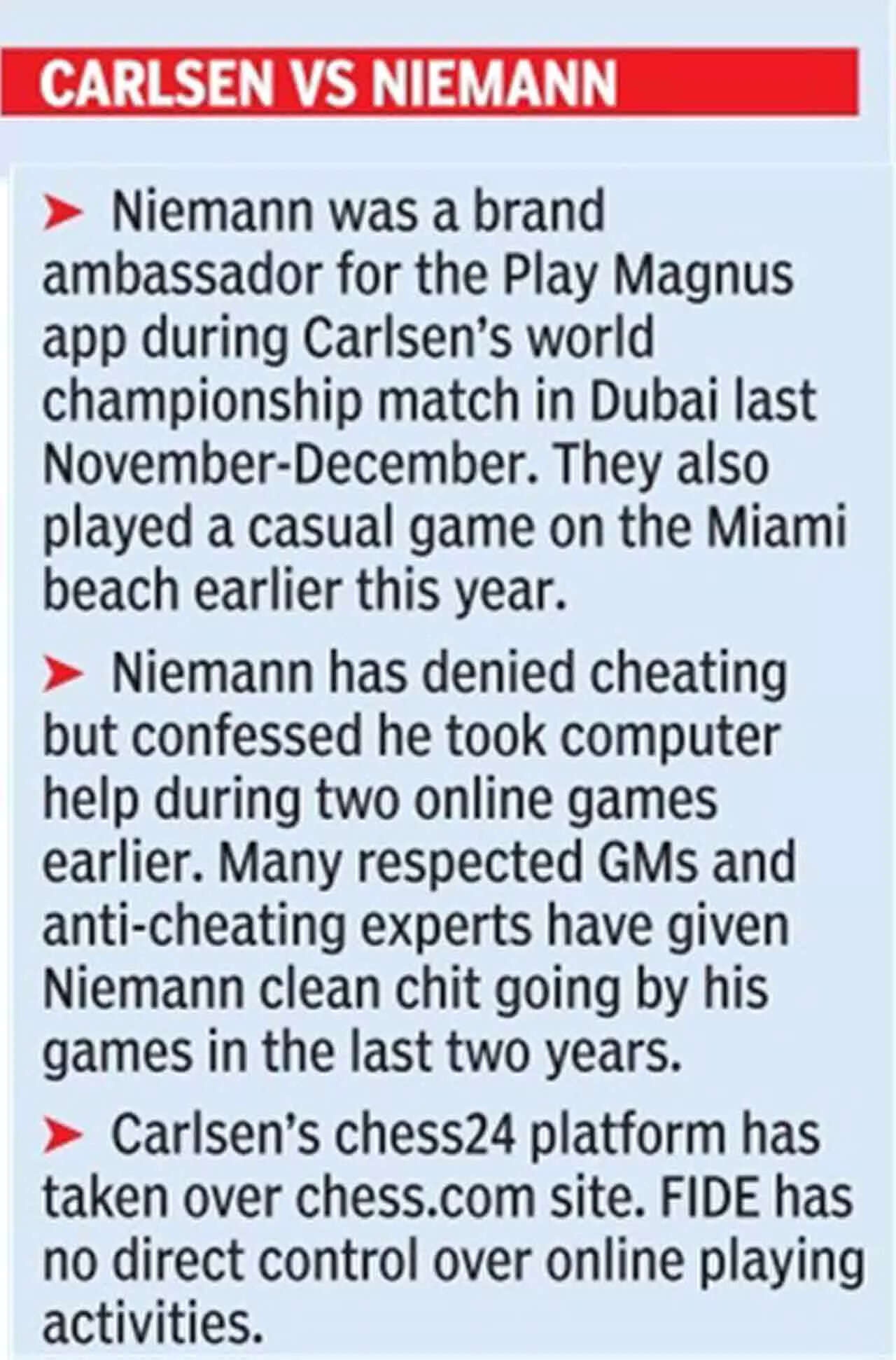 It's over to Niemann now to respond. If he sues the world champion, it will be a long-drawn battle. And if he attacks Carlsen verbally, there will be mud thrown at each other by various powerful parties including online leaks and private data.