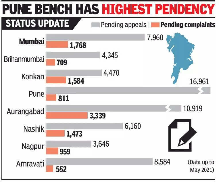 According to the data, 63,045 pending appeals have been uploaded on the website of which the Pune bench has the largest pendency of 16,961, followed by Aurangabad with 10,919. Altogether 11,195 complaints are pending, with the Mumbai bench registering a pendency of 1,768 complaints.
