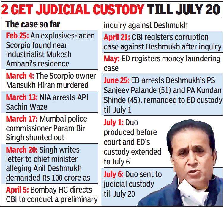 Last week, while seeking the duo’s custody, the ED had submitted that Palande, in his statement, said Deshmukh had a role in transfer postings of police officers, specially those in the IPS. The agency added that investigations had revealed a meeting was held to discuss transfers of police and IPS officers and that an unofficial list of candidates was prepared.