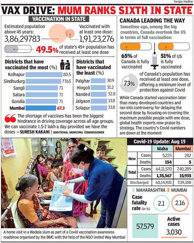 MUMBAI: Even as the fear of a third wave looms over the state, barely 50% of its most vulnerable age group—those above 45 years—have got even one dose of the Covid-19 vaccine.