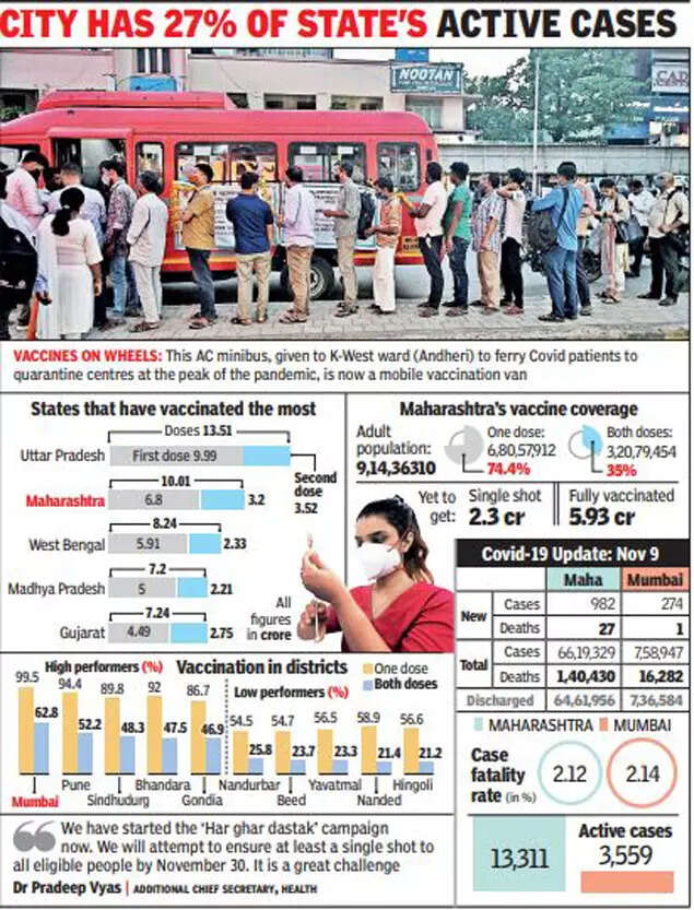 Chief minister Uddhav Thackeray and public health minister Rajesh Tope applauded health workers for achieving the feat and said funds and manpower were provided to accelerate vaccination. The minister reiterated that districts have been asked to draw up micro plans to maximize coverage in the next 20 days. The ‘har ghar dastak’ drive has been initiated nationally from November 3 to speed up coverage of both first and second doses.