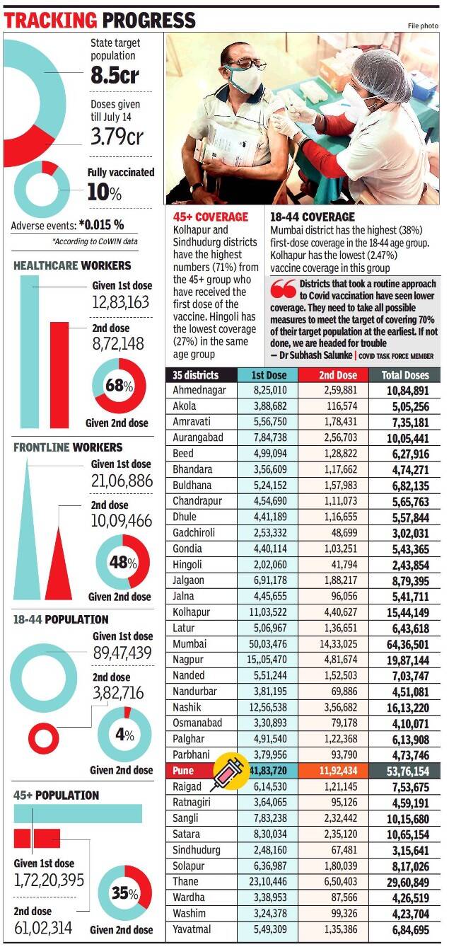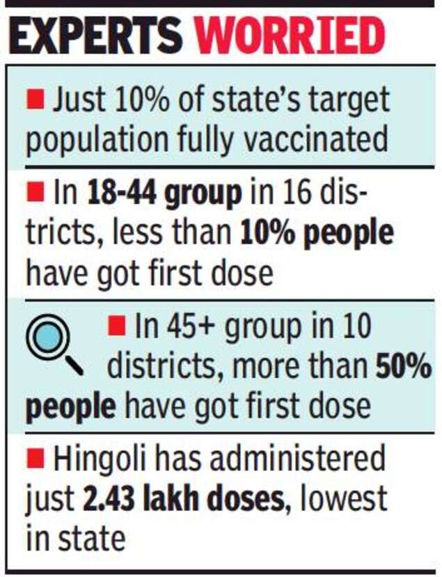 PUNE: Maharashtra is slightly behind Covid vaccination leader Uttar Pradesh in doses administered so far — 3.8 crore vs 3.9 crore — but its second-dose coverage is the highest. However, six months into the vaccination programme, only 10% of Maharashtra’s target population has been fully inoculated and the slow pace has got experts worried.