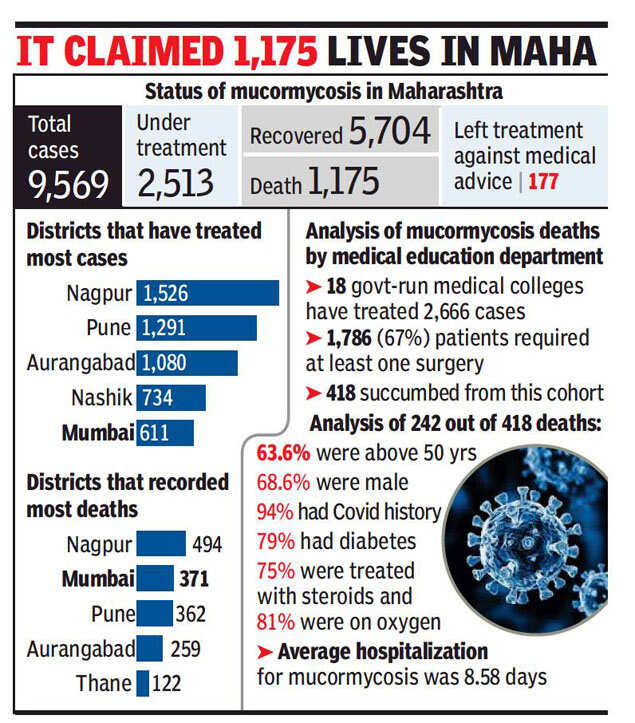 While 94% of those who succumbed to mucormycosis had a history of Covid-19, the rest hadn’t suffered from Covid-19 in the recent past. “The findings are an attempt to understand what can be done to prevent those risk-factors from either arising or coming together in the future. Mucormycosis not just has a high fatality rate, it can also leave people with disability,” said Dr Rakesh Waghmare of the medical education department. During its peak, hospitals have carried out an average of 8-10 mucormycosis surgeries every day, some very debilitating where people have lost palate, eyes and the jawbone.