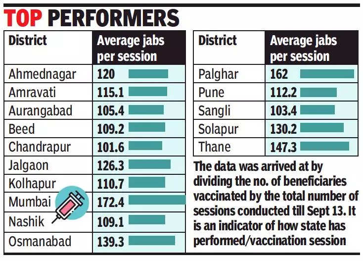 In Mumbai, the average vaccinations per session has increased from 158 beneficiaries earlier to 172 now. Other districts vaccinating an average 100-plus beneficiaries per session include Ahmednagar, Amravati, Aurangabad, Beed, Chandrapur, Jalgaon, Palghar, Nasik, Thane and Kolhapur.