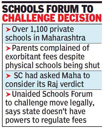 However, S C Kedia, secretary of the Forum, said the latest decision too will be legally challenged by the Forum. He said as per the Fee Regulatory Act, the state does not have powers to regulate fees. There are over 1,100 private schools in Maharashtra.