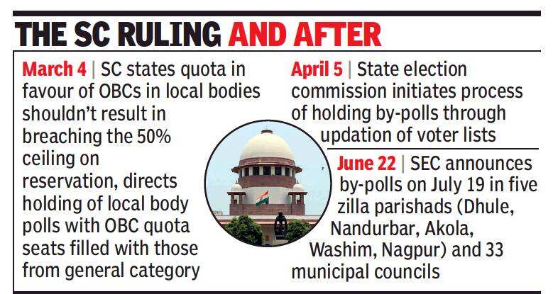 After the SC directed that by-polls for seats meant for OBC candidates should be filled with candidates from the open category, the SEC had said the by-polls in five zilla parishads and 33 municipal councils would be held on July 19. The state government had written twice to the SEC, in the last week of June and on July 7, requesting it to postpone the by-polls in view of the pandemic and the possible third wave.