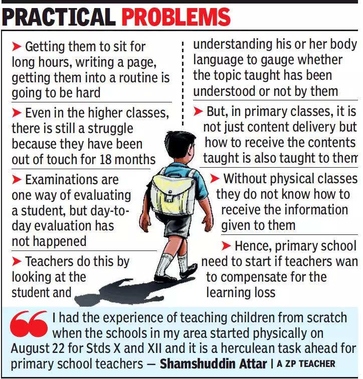 A teacher from ZP school in Khed taluka said the students who are in Std II this year are completely blank. “When they joined in Std I, the pandemic had started and hence there was no school.,Now, they are in Std II where they are supposed to learn tougher things. But, when these students cannot even recognise numbers or letters, then how can we teach them words, sentences or basic mathematics. When they enrol in Std I, we hold their hands and make them write. But now they have no clue. The same is the case with the students who have joined the Std I now. There is a need to immediately reopen school or we are failing our children in their basic right to education,” the teacher said.