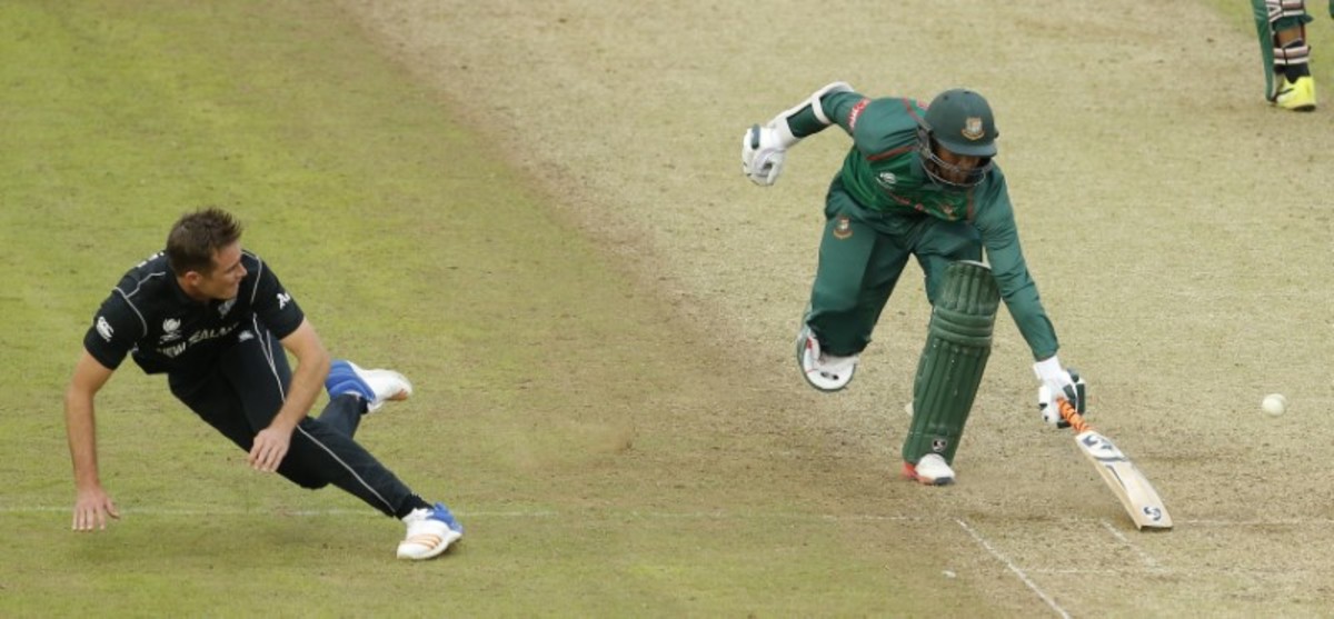 Britain Cricket - New Zealand v Bangladesh - 2017 ICC Champions Trophy Group A - Sophia Gardens - June 9, 2017 New Zealand's Tim Southee attempts to run out Bangladesh's Shakib Al Hasan Action Images via Reuters / Andrew Couldridge Livepic