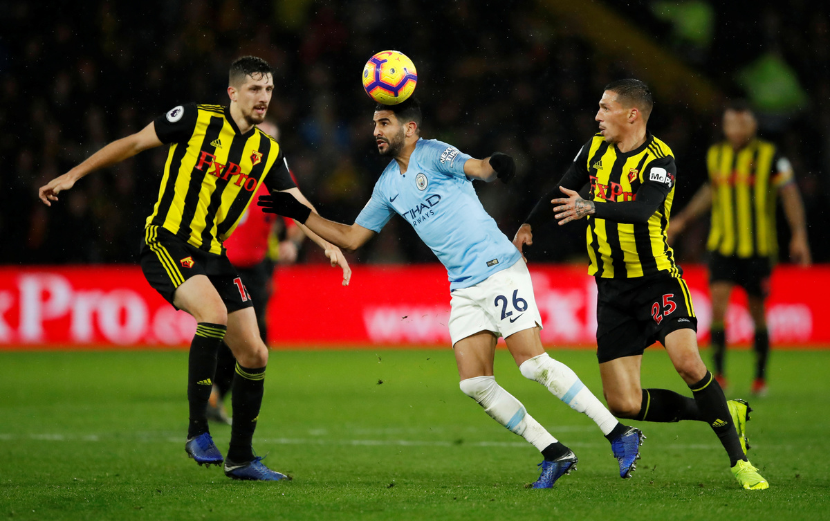 The home side had kept City at bay for most of the first half but Ben Foster's goal was finally breached five minutes before the break when a cross from Algerian Mahrez was edged past the goalkeeper by the chest of Leroy Sane.