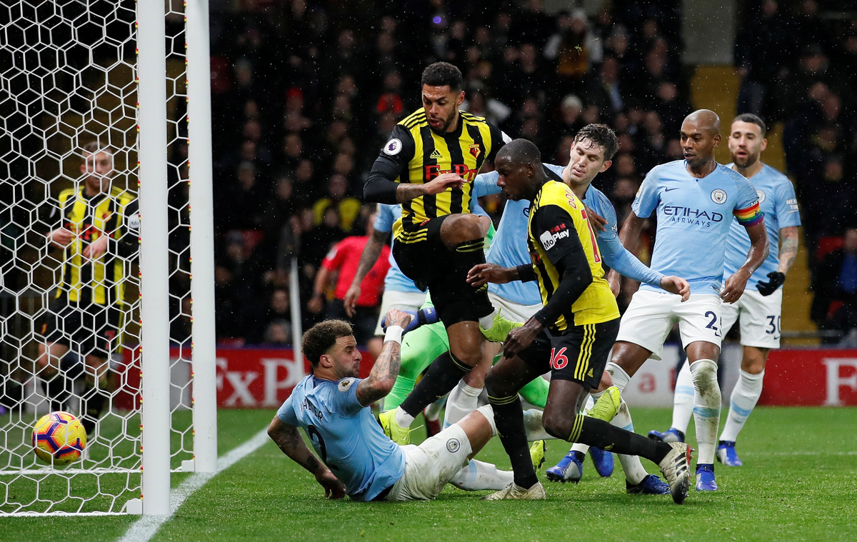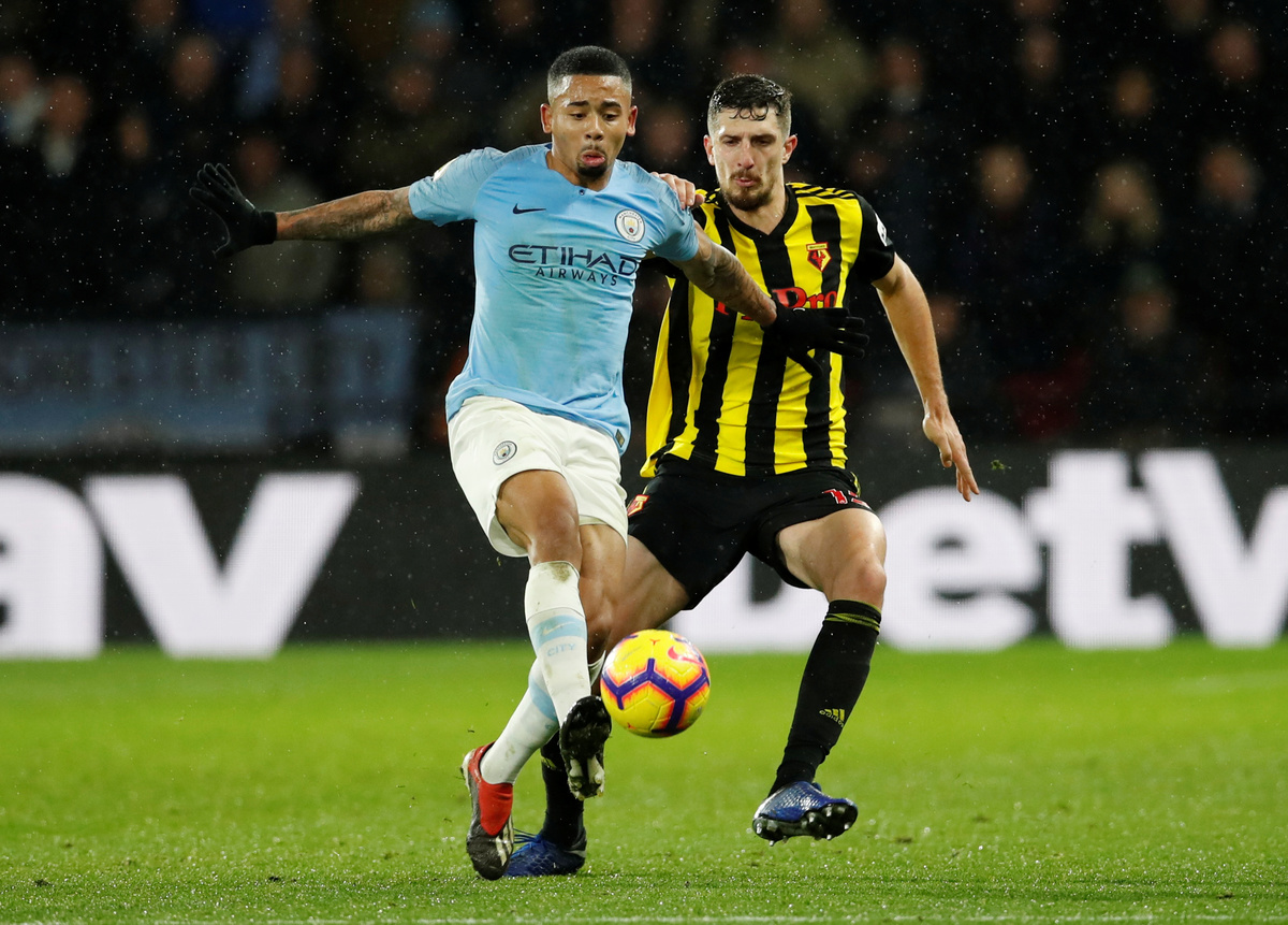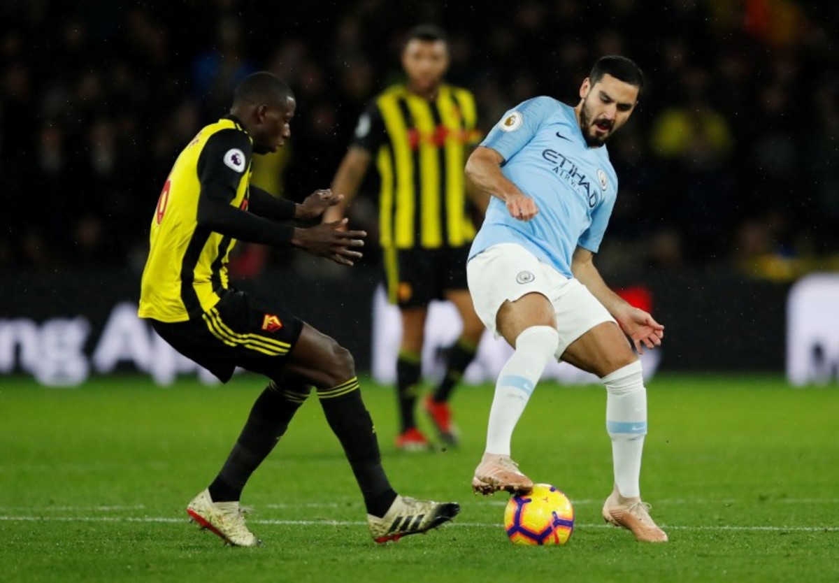 Soccer Football - Premier League - Watford v Manchester City - Vicarage Road, Watford, Britain - December 4, 2018 Manchester City's Gabriel Jesus in action with Watford's Craig Cathcart REUTERS/David KleinSoccer Football - Premier League - Watford v Manchester City - Vicarage Road, Watford, Britain - December 4, 2018 Watford's Abdoulaye Doucoure scores their first goal REUTERS/David KleinSoccer Football - Premier League - Watford v Manchester City - Vicarage Road, Watford, Britain - December 4, 2018 Manchester City's Ilkay Gundogan in action with Watford's Craig Cathcart Action Images via Reuters/Andrew BoyersSoccer Football - Premier League - Watford v Manchester City - Vicarage Road, Watford, Britain - December 4, 2018 Manchester City's Ilkay Gundogan in action with Watford's Abdoulaye Doucoure Action Images via Reuters/Andrew BoyersSoccer Football - Premier League - Watford v Manchester City - Vicarage Road, Watford, Britain - December 4, 2018 Manchester City's Ilkay Gundogan in action with Watford's Craig Cathcart Action Images via Reuters/Andrew Boyers