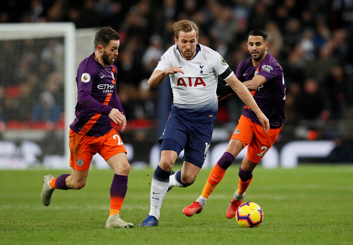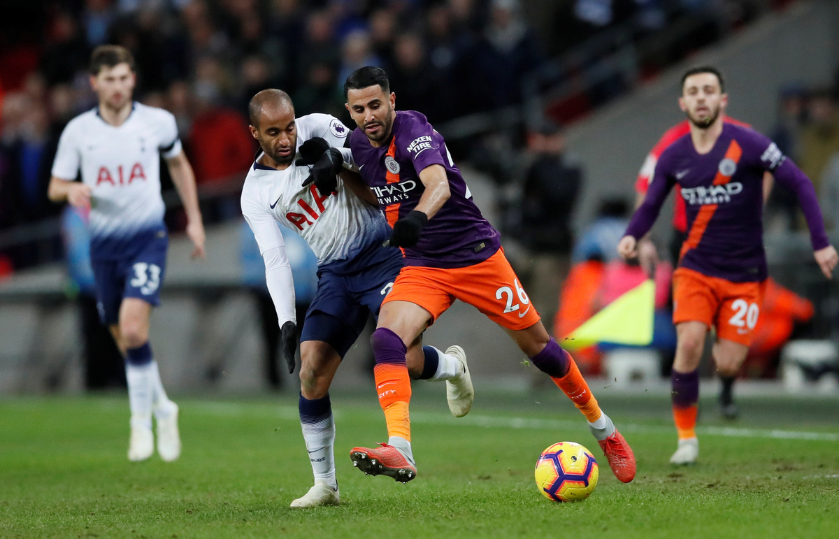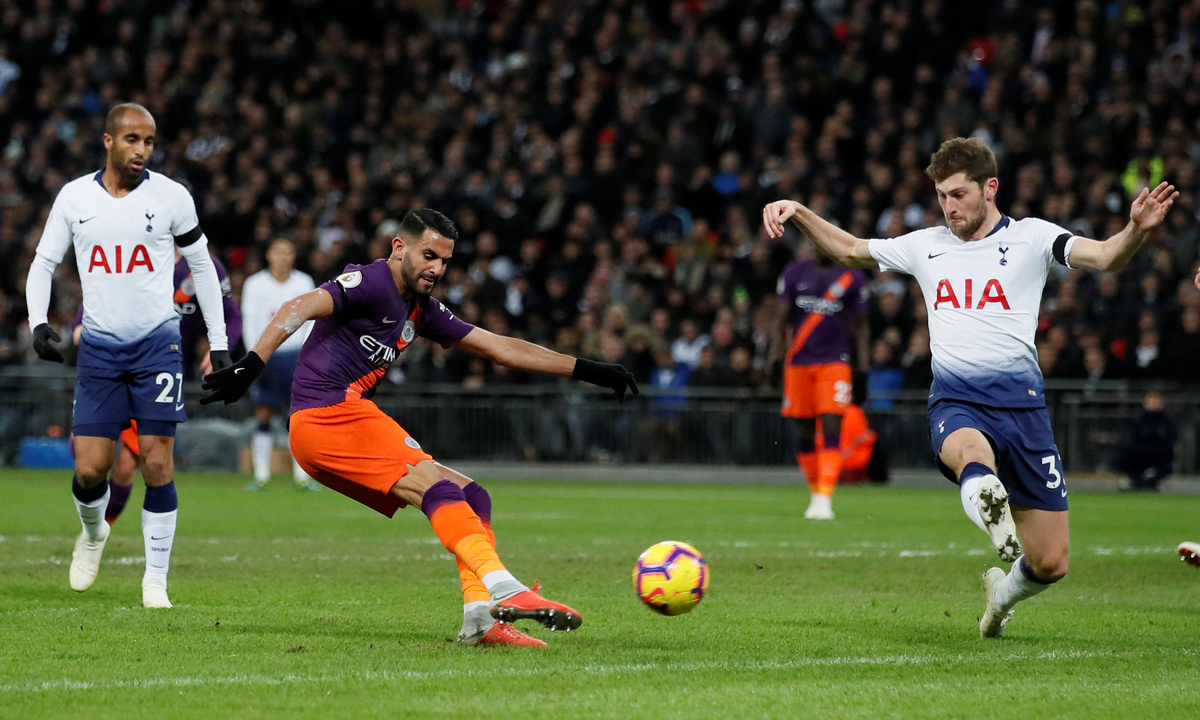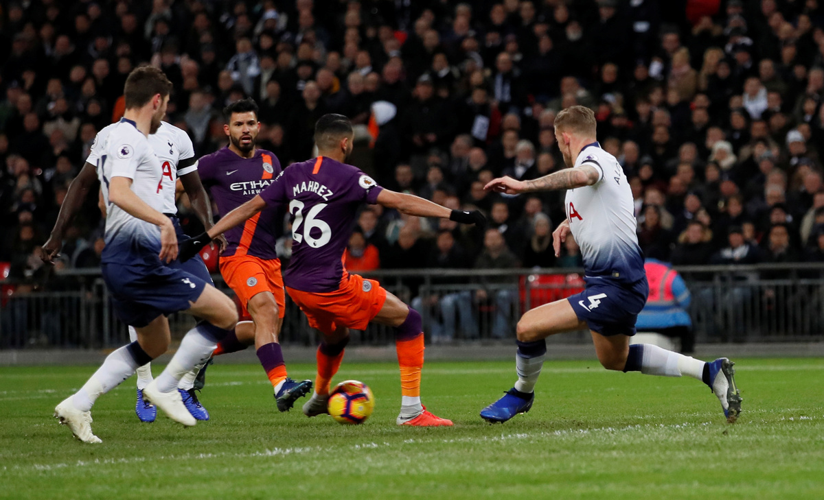 The game was only six minutes old when City goalkeeper Ederson launched the ball forward and Spurs right back Kieran Trippier made a mess of his clearing header. That let in Raheem Sterling, who squared for Mahrez to fire home past Hugo Lloris.