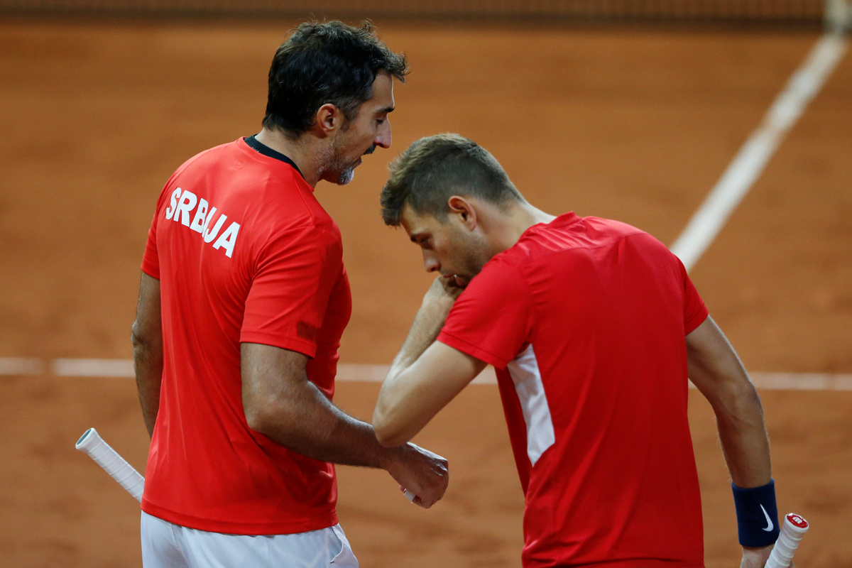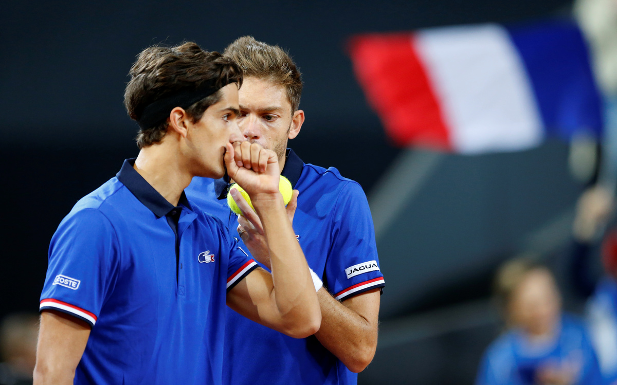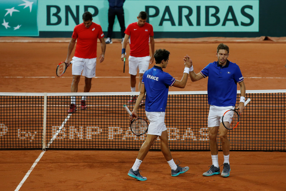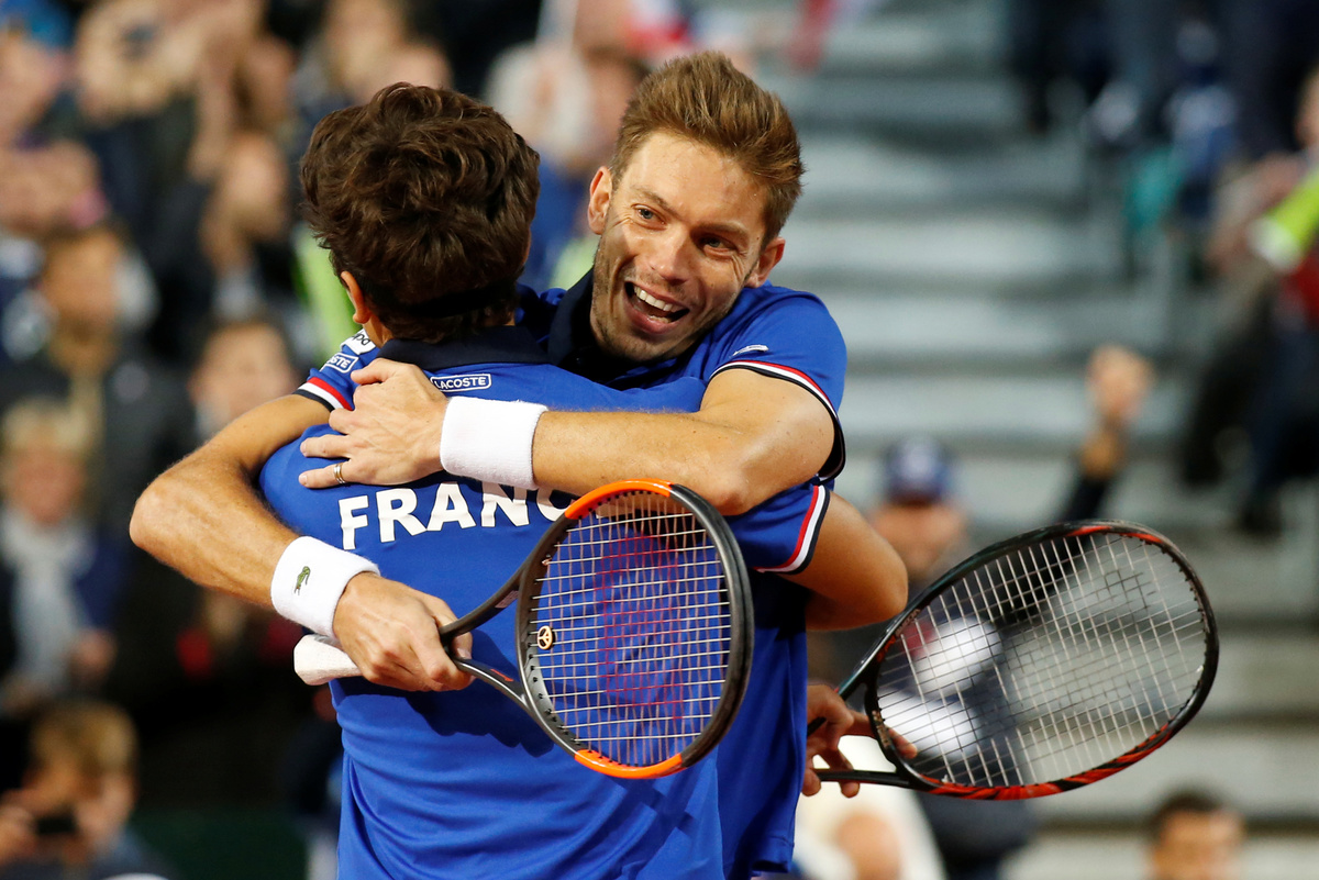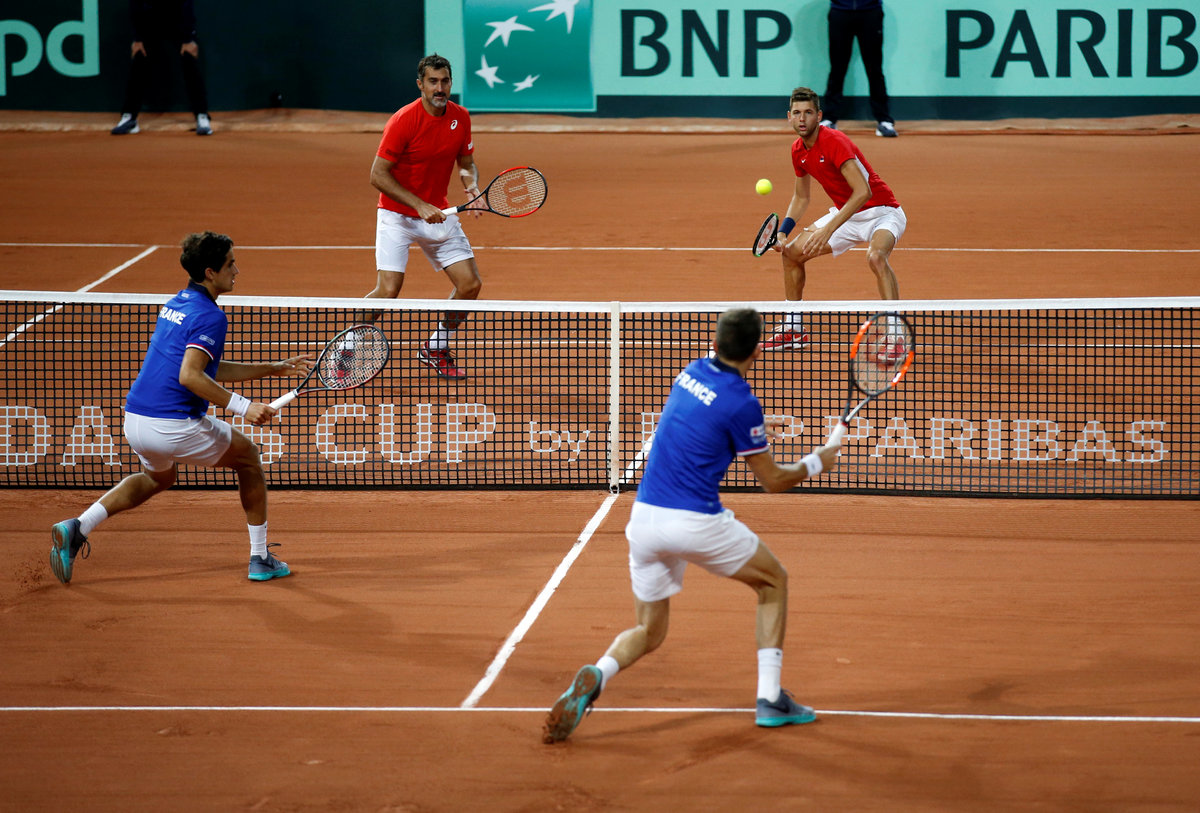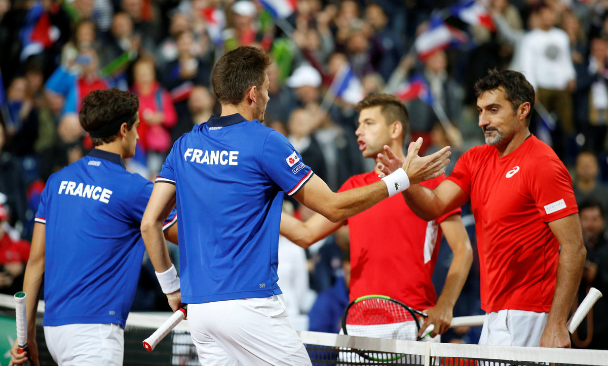 Tennis - Davis Cup - Semi-Final - France vs Serbia- Stade Pierre-Mauroy, Lille, France - September 16, 2017 Serbia's Filip Krajinovic and Nenad Zimonjic during their doubles match against France's Pierre-Hugues Herbert and Nicolas Mahut REUTERS/Pascal RossignolTennis - Davis Cup - Semi-Final - France vs Serbia- Stade Pierre-Mauroy, Lille, France - September 16, 2017 Serbia's Filip Krajinovic and Nenad Zimonjic in action against France's Pierre-Hugues Herbert and Nicolas Mahut during their doubles match REUTERS/Pascal RossignolTennis - Davis Cup - Semi-Final - France vs Serbia- Stade Pierre-Mauroy, Lille, France - September 16, 2017 France's Nicolas Mahut and Pierre-Hugues Herbert during their doubles match against Serbia's Filip Krajinovic And Nenad Zimonjic REUTERS/Pascal RossignolTennis - Davis Cup - Semi-Final - France vs Serbia- Stade Pierre-Mauroy, Lille, France - September 16, 2017 France's Pierre-Hugues Herbert and Nicolas Mahut during their doubles match against Serbia's Filip Krajinovic and Nenad Zimonjic REUTERS/Pascal RossignolTennis - Davis Cup - Semi-Final - France vs Serbia- Stade Pierre-Mauroy, Lille, France - September 16, 2017 France's Nicolas Mahut and and Pierre-Hugues Herbert celebrate winning their doubles match REUTERS/Pascal Rossignol